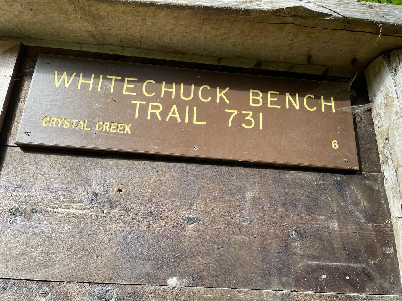 Also, the trail does not ‘peter out in underbrush’. It turns & heads uphill again. A horse party approaching confirmed our suspicion: the trail continues for 3+ more miles to a camp on the river (possibly the “Crystal Creek -6” that is indicated on the wooden sign at trailhead?) Before that, there is no river access.
