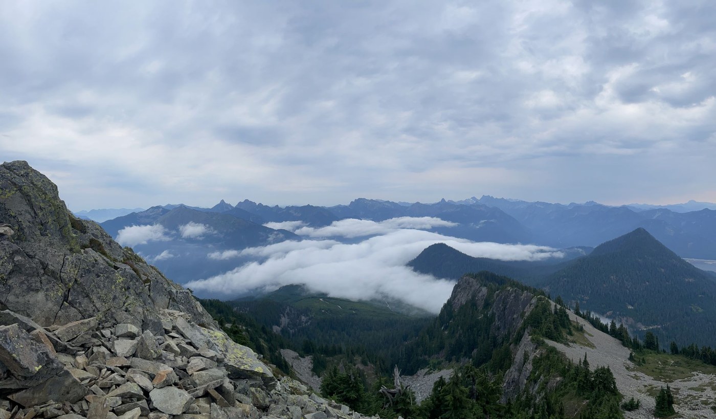 Much easier trail after that--wider, clearer, breezy, fewer rocks, and flatter. About 25 minutes I came along the leftward branch trail to Silver Peak. It took about a half hour to make the top, and for the 30 minutes I was highest up there I was completely swarmed by mosquitoes, swatting four at a time. Even the breeze at the top was no deterrent. Didn't stay at the top long (good views despite the cloudy day) and headed back to the PCT northbound, which was a pleasure to hike on (really good size and condition and no more bugs!). I headed up to the jct with road 9070 and back south half or 3/4 mile to my car at the 4:35 mark. I was spent, but did not spend enough time on trail, so I drank some gatorade and crossed the road to the Catherine trail (also 1348).