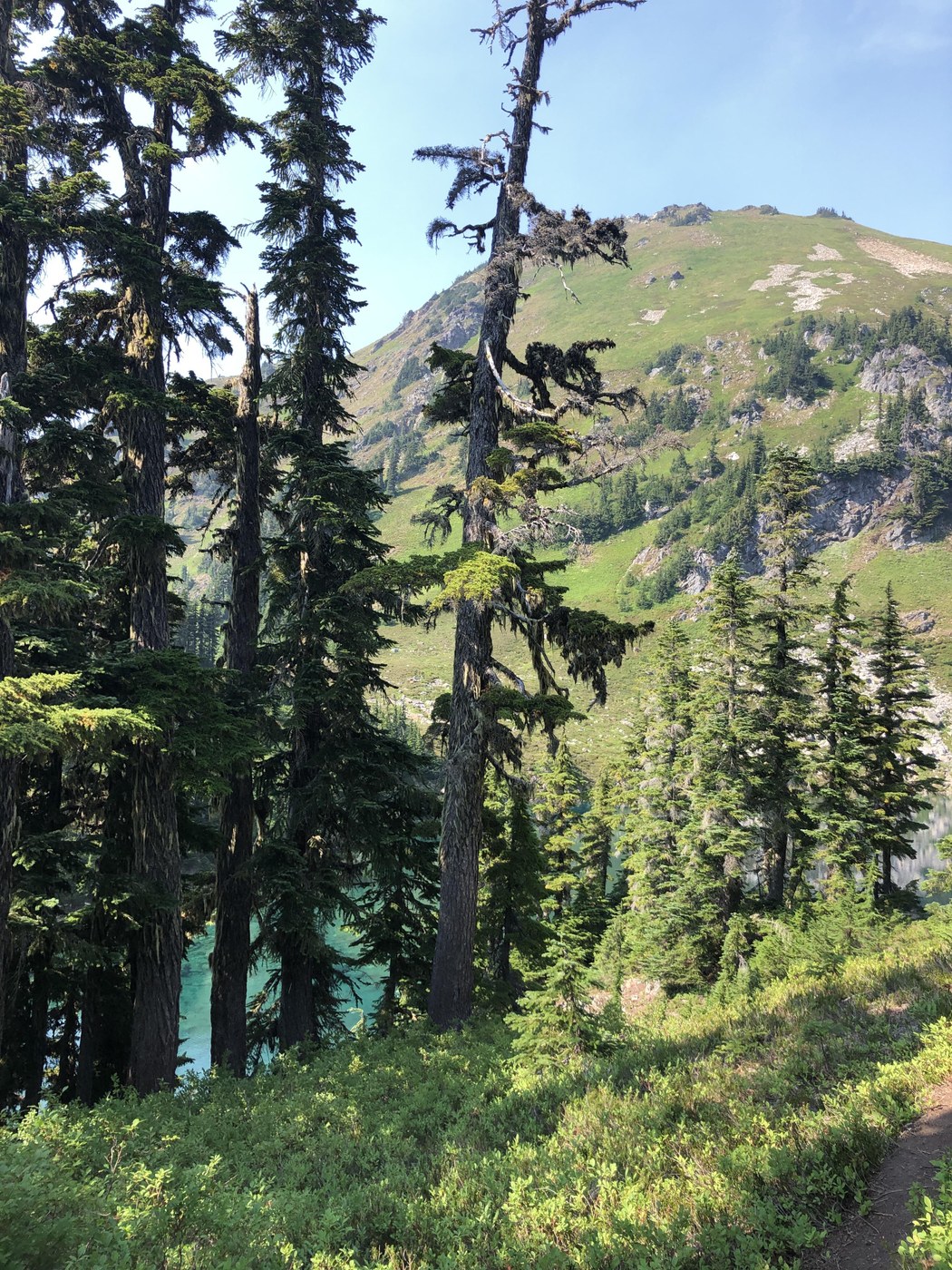 The trail to White pass is in great shape and well maintained. A WTA crew was making further improvements early on the trail. It is a nice hike in the woods (beautiful old large cedars, etc.) for most of the hike and then a steep uphill to connect w the PCT. As we emerge from the woods the views are amazing (Saulk Glacier). And berries became plentiful and ripe. We camped at white pass. 11.8 miles
