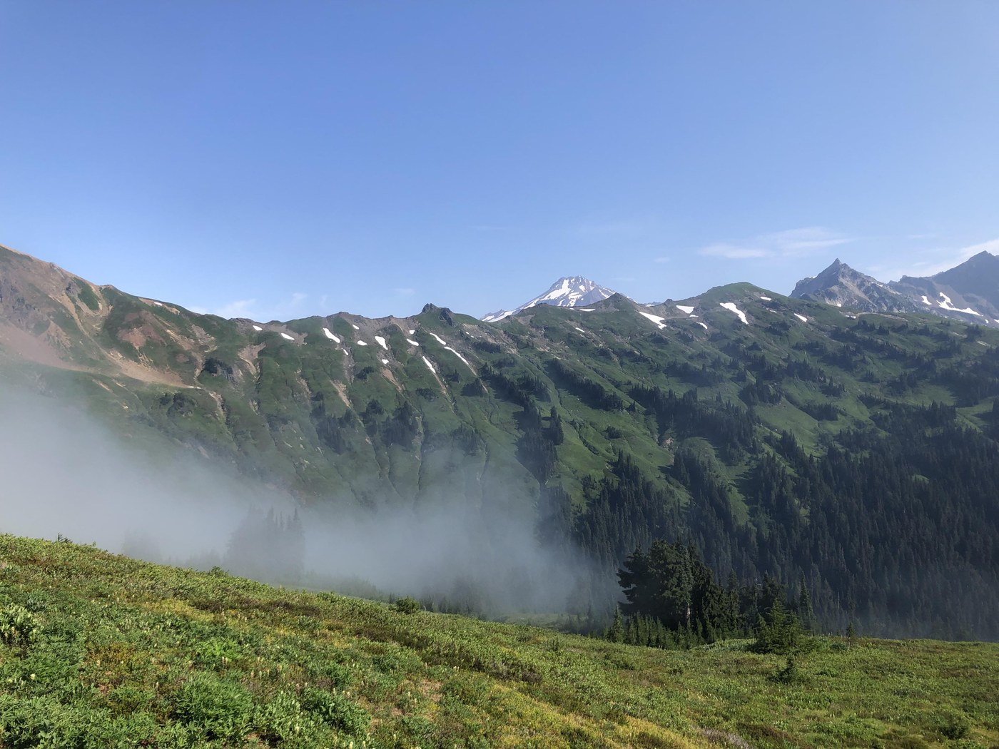 day 3 was to catch up to Pilot trail. Views of Rainier, Goat peaks,… and many mountains in between. Not many water sources till the final downhill part of that trail. The Saulk river crossing is made on large tree trunks and the trail is being cleared up around this area. 11.5 miles