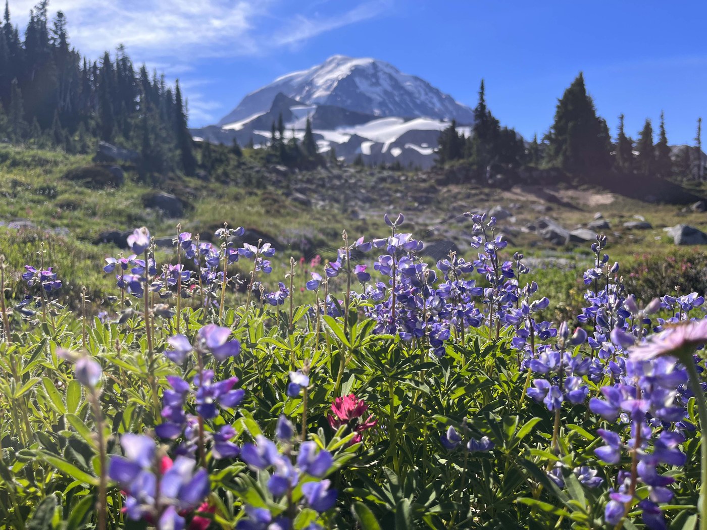 We heard several other hikers mention bear sightings (one who had turned around because the bear was on the trail ahead of him). As we entered the meadow, Rainier was majestic in the background! As we turned a bend, another group said they had seen a family of bears just ahead, and we just caught a glimpse of a baby scurrying across the trail to catch up.