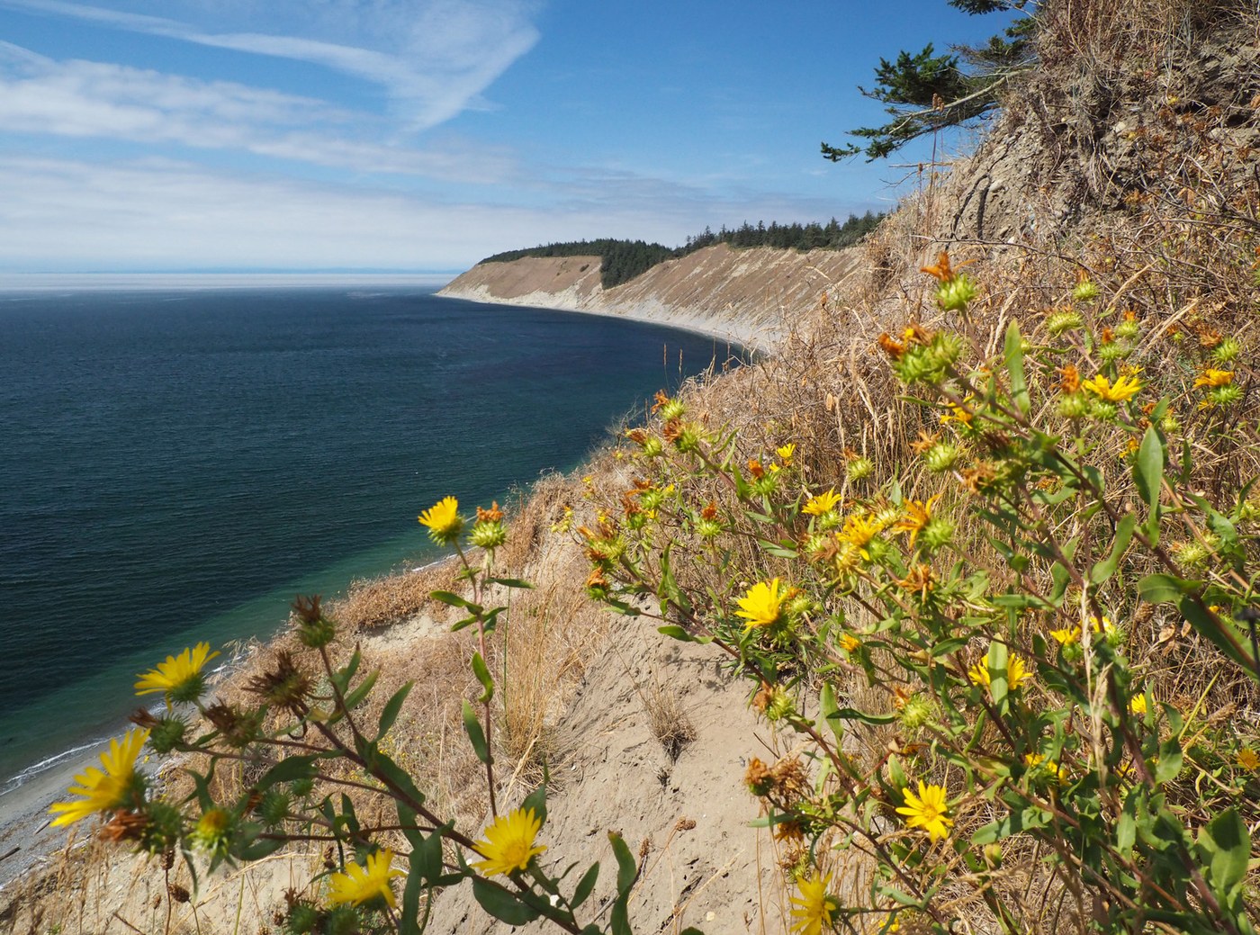 We started at the beach trailhead and went northwest along the shoreline. I t was about three hours before high tide and there was lots of room to walk. At the north end of Perego's Lake we took the trail up to the bluff. Since the last time I was here there has been some significant erosion, especially at the first switchback. It is on the upside of the trail and at that point it has made the trail wider, but in other places there is some narrowing making an already narrow tread a bit more tricky.
