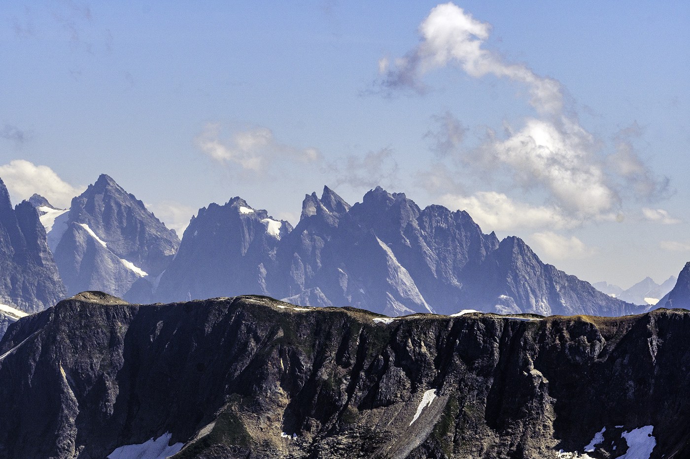 We headed out of the basin around noon, and off on the 1000' or so of gain to get to the lookout. The switchbacks are short and steep, and it never really lets up. You'll be high above the lake soon, and it is a beautiful view back down into the basin. The fog was gone by now, and there was a great breeze to make the sun somewhat tolerable. The views though. WOW. It's hard to make good time when you're stopping every minute to take a photo. Got to the lookout just before 2pm and had the entire area to ourselves (we met the ranger down by Copper Lake). The views here are just amazing. Peaks upon peaks upon peaks in every direction. We stayed for about an hour just taking in the views and enjoying the day.