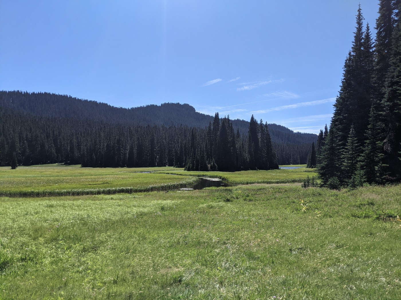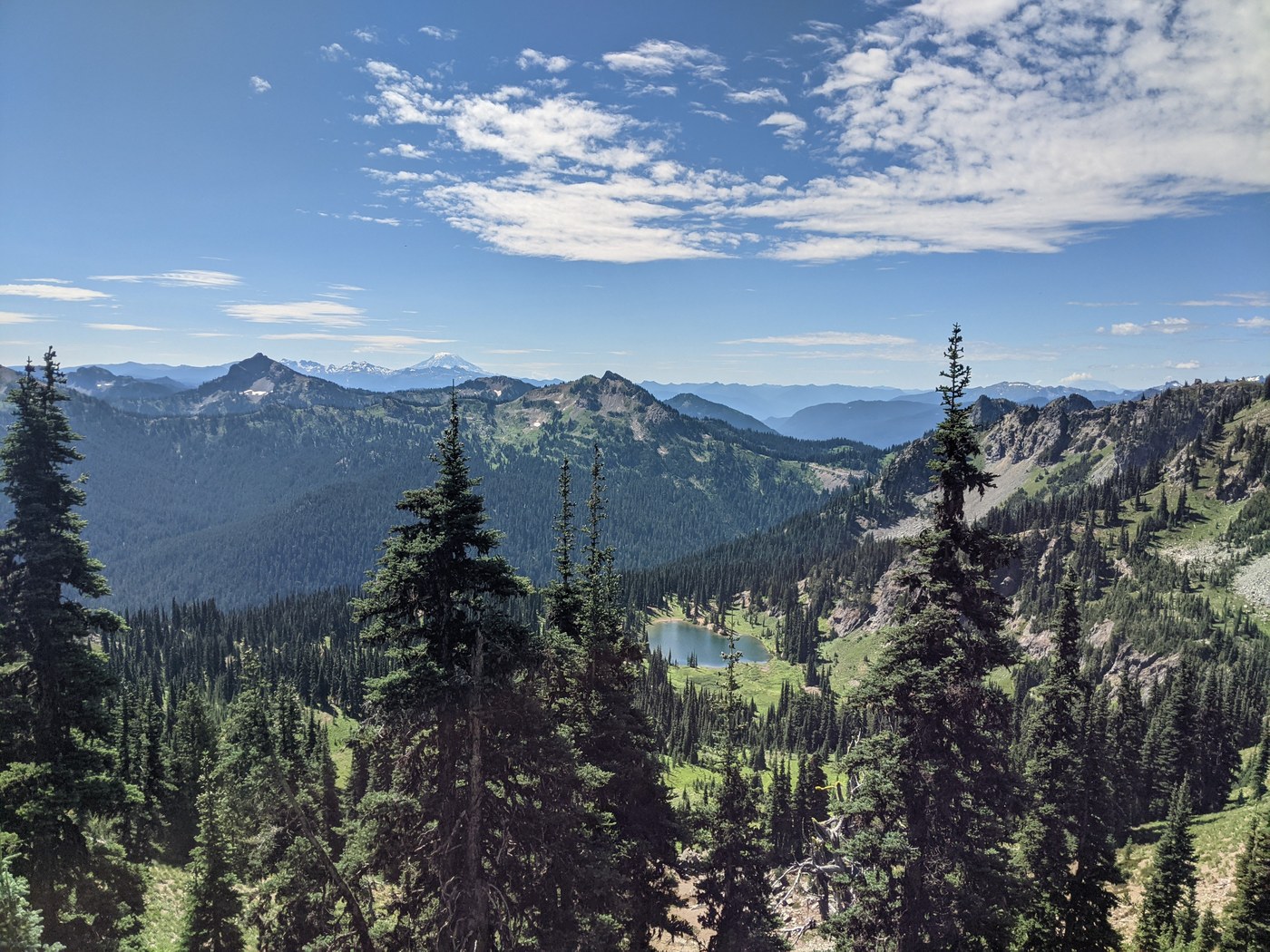 The first half of the day went really fast, easy mileage and elevation- all in the forest. Bumping River Ford has a down tree to the left of the trail that a lot of people missed. Great place to stop and relax before the push up. I was planning on staying at the Crag Lake camp area, and it didn't call to me. It is below Crag Lake, so no lake views, kind of dark, and just next to the trail. I ended up pushing on, which provided some beautiful views of Crag lake as you move up the ridge. There were a couple small trails off that would take you down to camp in a meadow by the lake, but I was worried about bugs and pushed on. At the top of the ridge, you reach the edge of Rainier NP and have BEAUTIFUL views. Two Lakes junction had spots for 4 tents just off trail, and a couple others found more slopped locations just a little down the trail to Two Lakes.