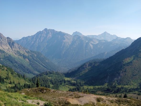 Started at 7:30 am to try to beat the heat. Didn't really work, it was already hot by the 2nd mile, though I'm sure it would have been worse later in the day. Couldn't beat the smoke, either - I didn't smell it and breathing wasn't hard but visibility was definitely reduced. That being said, even a so-so day in the North Cascades beats a good day at work. The berries were everywhere - my fingers were purple by the time I turned around, 1.5 miles along the High Divide. There were some bugs, but they weren't too bad if you kept moving, and once I got to the pass there was a breeze that kept most of them away.