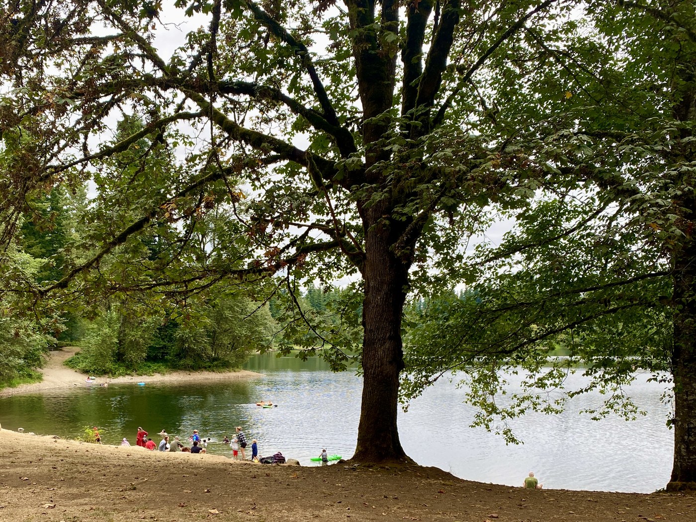Not busy for a holiday weekend. 1/4 of the picnic tables were still open. Maybe a couple dozen people at the lake swimming.