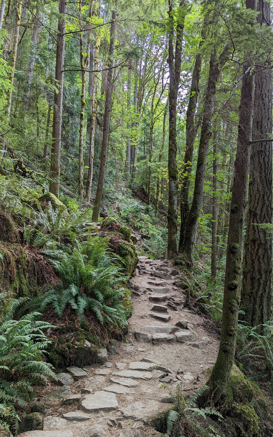 A dusty trail and rocky too, but not terrible. Just need to pay attention. Nearly the entire way to the Point is a steady incline. Not unreasonable, but we weren't rushing it. Nice lookout near-ish the top to see the paragliders launch and with Rainier in the distance.
