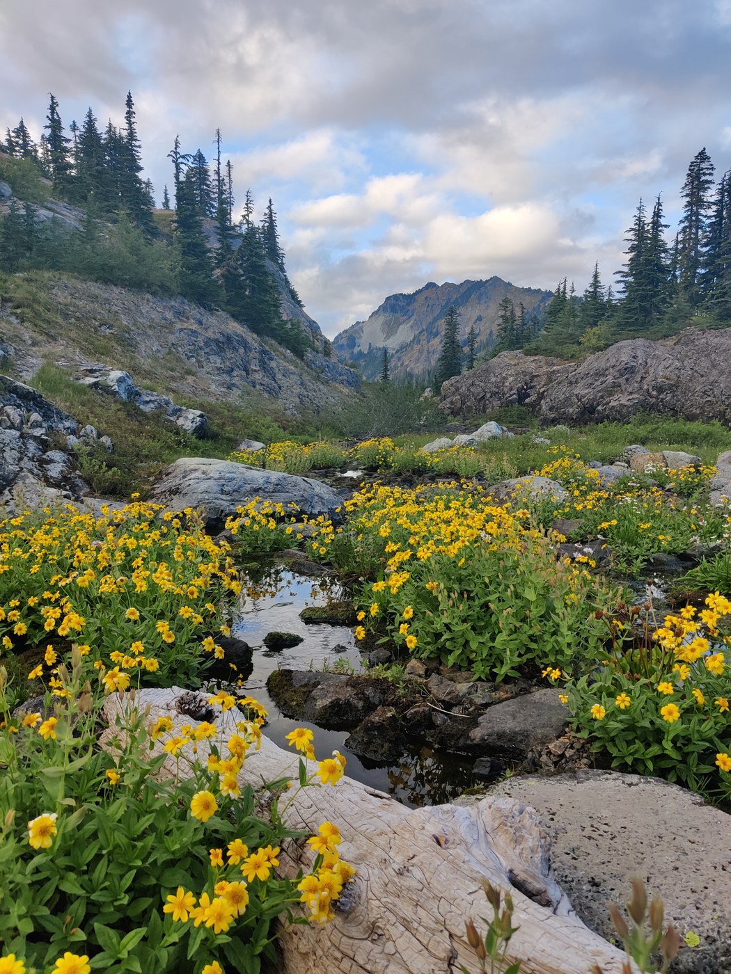 Climbing up to Ramparts is another half mile, with a reasonable elevation gain and some patches prone to sliding. Turning left takes you to the Ramparts, where a ton of social trails cut between the fragile meadows and many ponds. As a late arrival, we dropped our packs and scoured, but had to settle on an exposed slab by the water.