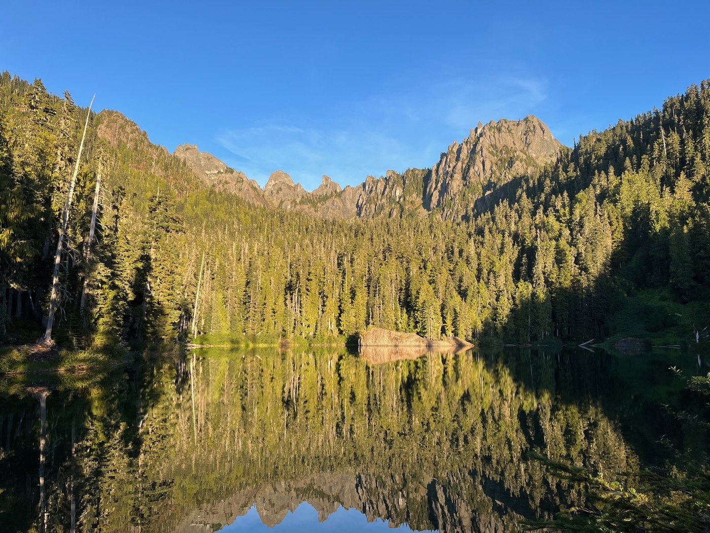 We took a right at the junction to head towards Flapjack Lakes and what seemed like more than half a mile up even steeper, rockier, and rooty trail conditions. About halfway up from the junction there's a lot of waterfalls to rest and recover beside; some have better access to water than others. We arrived at the lakes after hiking about 5 hours and tackling the five or so blowdowns we encountered. We took a left at the sign announcing the lakes and camped at the first camp on the right along the upper lake. We explored the other camps and found that the next best camp was at the far end of the lower lake and has a view towards the peaks. We ultimately decided we would rather be closer to the toilet. Two other groups arrived later in the afternoon and into the evening. After dinner we walked out on the strip of land in between the upper and lower lake as far as the outlet of the upper lake that feeds the lower lake. We were in PJs and opted not to cross the loose logs that straddled the outlet and would come back the next day. On our way back to camp we saw one mama grouse with a baby. They were camouflaged so good that my hiking partner didn’t see them.