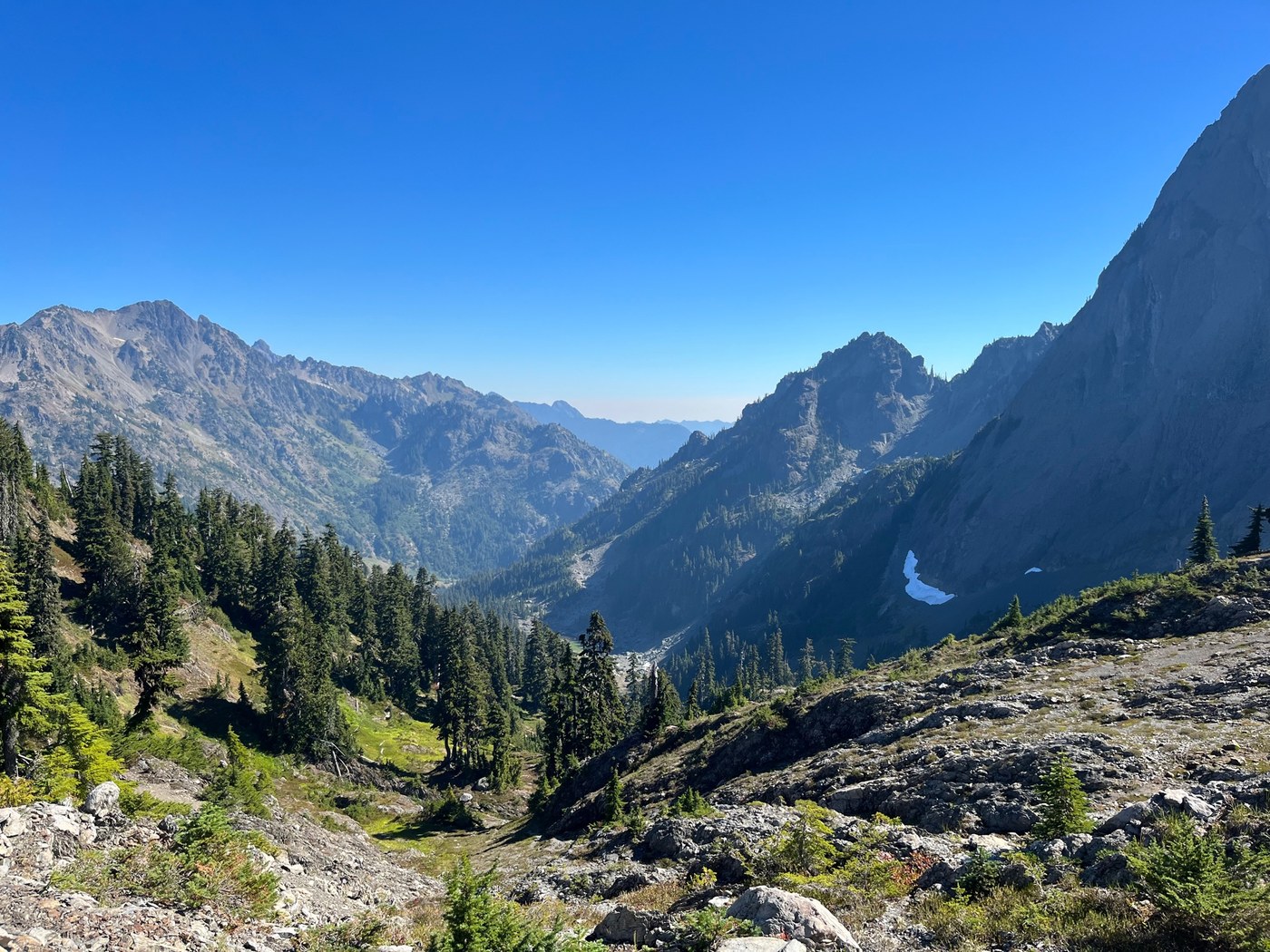 Day 2 - We day tripped up to Gladys Divide and about halfway up to Mount Gladys. The trail to Gladys Divide could use some improvement but the view was worth it. There are three or four blowdowns, some places that there's no tread just loose dirt, and the first quarter mile or so the blueberry bushes are getting close to overgrowing the trail. The obstacles weren't terrible, just more than expected for a mile and a half trail. We saw some cool geologic features in the massive boulders, a few wildflowers lingering, and another grouse roosting in a bush along the trail that was flushed out when we passed. At the divide we spied a boot path to the left and followed it to see if we could get some views looking down on Flapjack Lakes. We hiked as far as a pair or tarns on the right. The views were beautiful. We turned around because we didn't have lunch packed with us and we had only planned to hike to the divide so we felt it was better to come back later for a summit when we were better prepared for a longer trip.