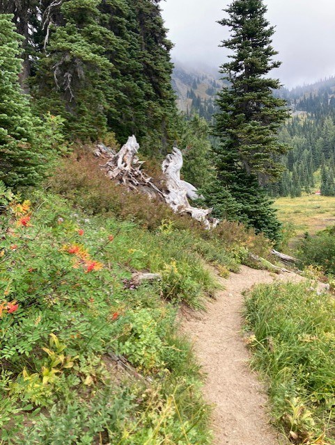 A quick overnight at Sheep Lake with a hike the next morning up to the gap. Was looking for something away from the smoke, and easy enough for my senior dog, since he loves camping so much. This fit the bill - a trail that’s great for older dogs, and all dogs alike, as well as kids. Parking is in a paved lot, off a paved road, so couldn’t be easier. Trail was packed and dusty, easy, very little in terms of rocks/roots (pretty much none). Plenty of sites to be found at Sheep lake, and it was nice to see some young families there. The cold is setting in however, and even in the space of a few days, I noticed that the leaves are starting to change their color. Berries are abundant, some wildflowers even, but both categories a bit past their prime. It did get pretty cold overnight, with low clouds in the morning. But still so beautiful with bits of blue sky peeking out and the sounds of pika all around. It was a perfect trip. Gray jays abound, as well as a chubby chipmunk looking well-fed, but on the search for extra snacks :)