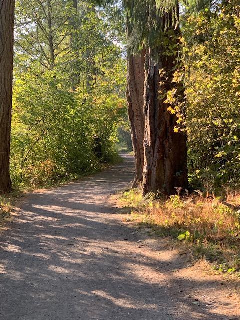 I saw birds, ducks, and a squirrel. It is a very scenic, mostly shady trail right by the water with lots of good size fir trees, a few flowering bushes, and some berry bushes. There were two signs that gave me pause: 1) Parking lot sign warning of vandalism as evidenced by the glass on the ground. 2) Several signs warning of no shooting. There was also a number of dog poop bags left on the trail. Overall, it was a nice, close to town place for a stroll, but probably a little more busy than I like. I might check the trail out at another entry point.