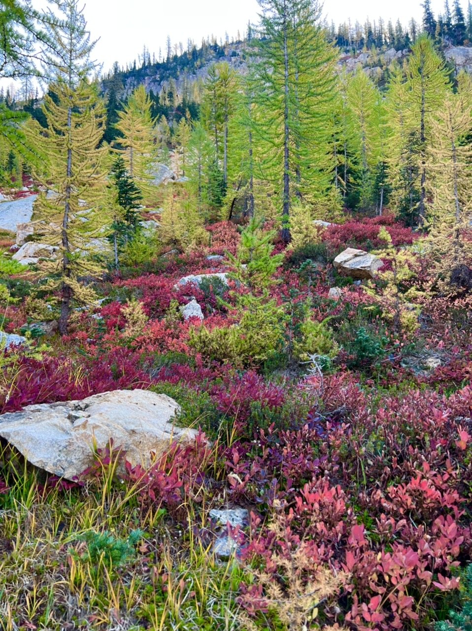 Hiking Cutthroat Pass today was spectacular. We pulled into the Th lot at Rainy Pass just after 8:30 and it was half full. The Forest Service Vault toilet was open with supplies. It was clear blue skies and in the upper 40’s. After 2 miles, going steadily uphill on the PCT, we started to shed our outer clothing layers and by 10:30 we’re down to short sleeves. The sun started coming through the canopy and was out across the valley on the south facing hillside. We walked back into the shade as the trail switchbacked to the south. It felt cooler but the yellowing larches, red blueberry foliage mixed in with granite boulders took your mind off everything but amazing scenery. Compared with our hike on the Heather / Maple Pass Loop yesterday this hike felt like we had it mostly to ourselves. We walked up to Cutthroat Pass junction and a few groups of hikers were scattered around in a 1/2 mile area taking a break and enjoying the amazing 360 degree views. The entire trail was dry and dusty and the few stream crossings were just a trickle.