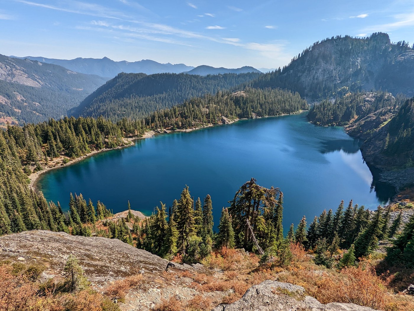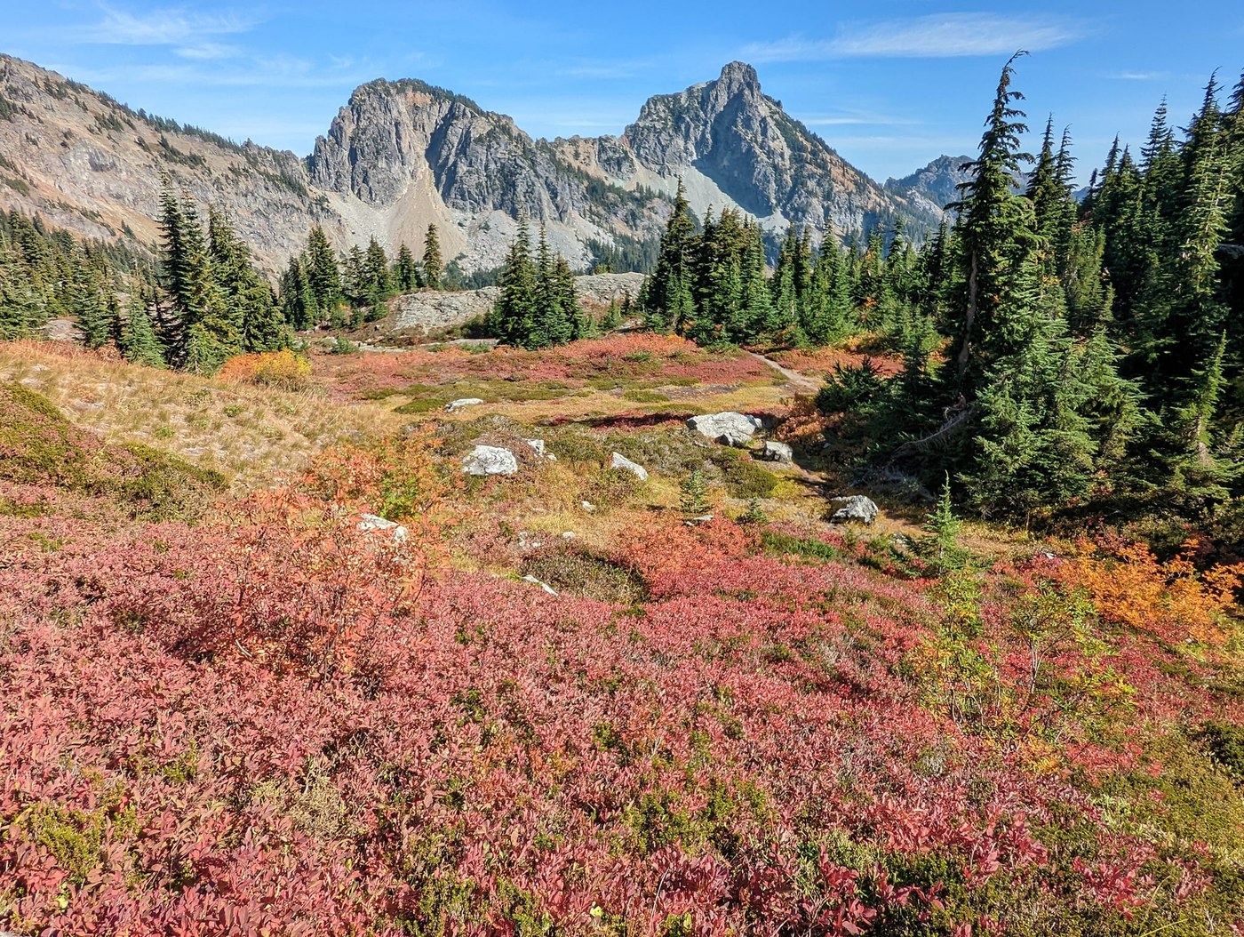 Trail starts steep then levels off for over 2 miles of mainly flat hiking. Then the last mile to Rachel Lake is rugged, steep with roots and rocks. Some pretty nice fall colors right at Rachel Lake. Then when the trail reaches the junction on top of Rampart Ridge, the colors get pretty great again. I turned right/north toward Alta Mountain. I hiked a bit on the ridge then I accidentally missed the Alta Mountain turnoff and continued on toward Lila Lake. As Adam Levine says, this turned out to be a "beautiful mistake" because I passed through some stunning meadows of fall colors! I passed a dried up pond then came to a nice big overlook of Lila Lake and turned around here, opting not to drop any further to the lake. Back near the dried up pond, I actually found an obvious boot path (not shown on Gaia) that connected up to the ridge, so I didn't have to backtrack too far and so the route actually ended up working out perfectly. I highly recommend that slight detour! Once back up on the ridge I continued on toward the summit. There are some rocky sections with some easy class 2 moves here and there, but nothing too difficult for the experienced hiker. Summit views were fantastic, especially looking across Gold Creek toward the colorful slopes of Alaska Mountain with Mt. Thomson rising behind. And looking out to Chikamin Peak and Lemah Mountain. Filtered water and then partially submerged myself in Rachel Lake to cool off before the hike out. On the hike back down the steep section below Rachel Lake I cut up my shin on a root sticking out and had to put my "WFA skills" into action to bandage it up real quick.
