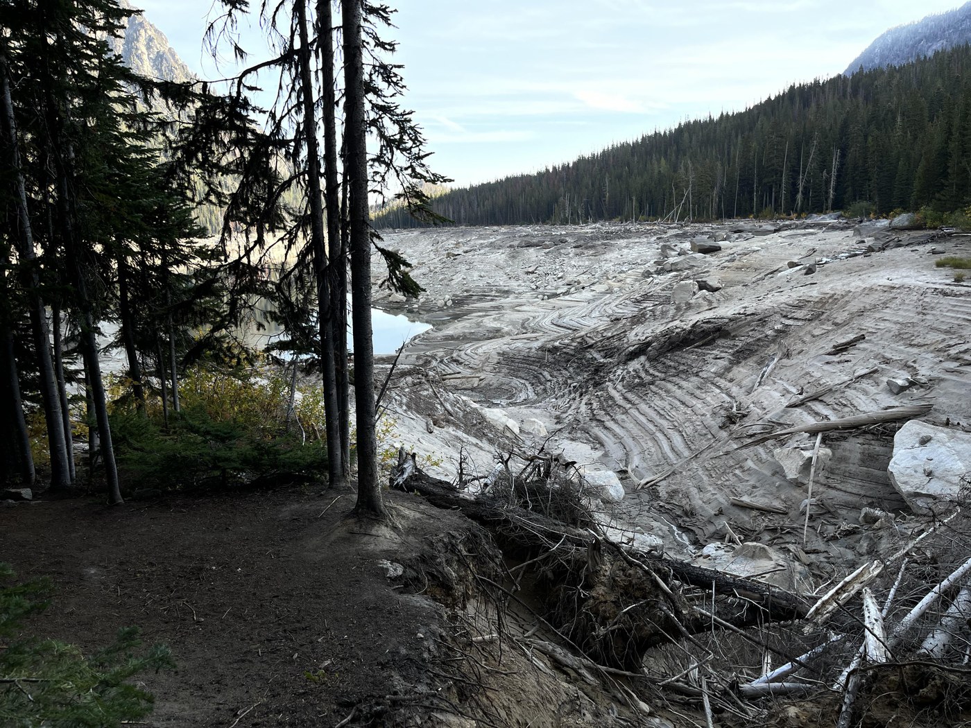 The water level of Upper Snow Lake was extremely low. Those camping along the lakeshore often camped on the beach and had to perilously go down to the water. Most chose to camp at the west end of the lake and get water from the stream entering the lake. (Be aware that this time of year, each year, the water level may be very low. See picture.)