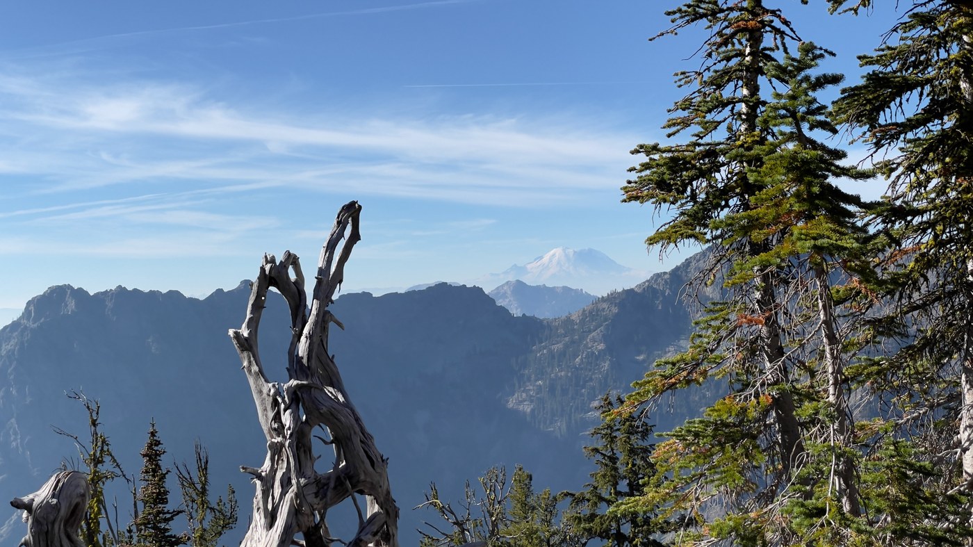 The AQI was getting worse as the day wore on, and on the way back all of the mountains were becoming less distinct. I did see one ground squirrel on the way down to the trailhead. We got back to the car about 15:30, with tired feet, but glad we had hiked this trail at the peak of the fall Larch color change, interspersed with the greens of the firs and pines. It’s a beautiful, rewarding hike.