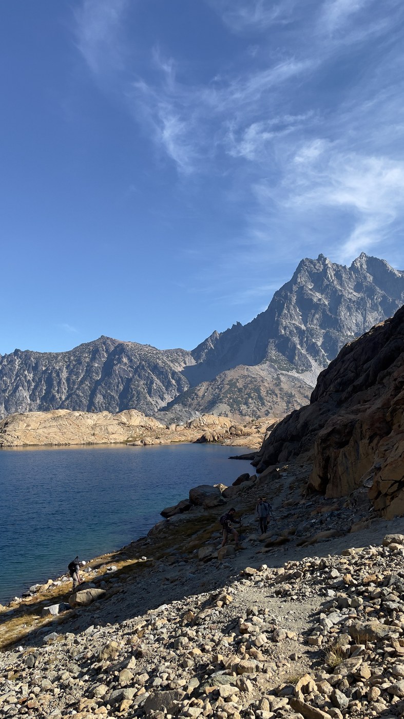 There was a pile-up of people at the choke point where the trail turned into a scramble up the rocks to the ridge top between Headlight Basin and the Lake Ingalls cirque, but that was the only place that happened all day. Once we overtopped the ridge, we got a peek-a-boo look at Lake Ingalls and a good view of Ingalls Peak.