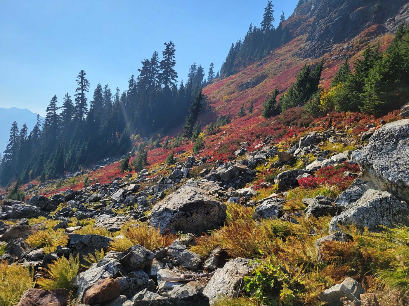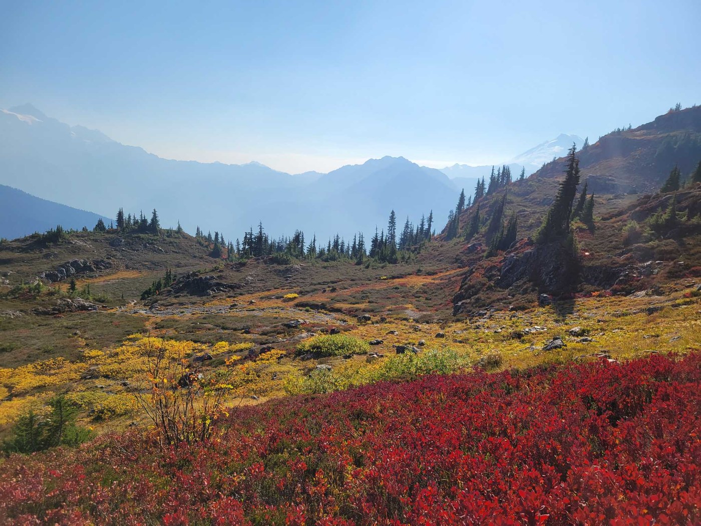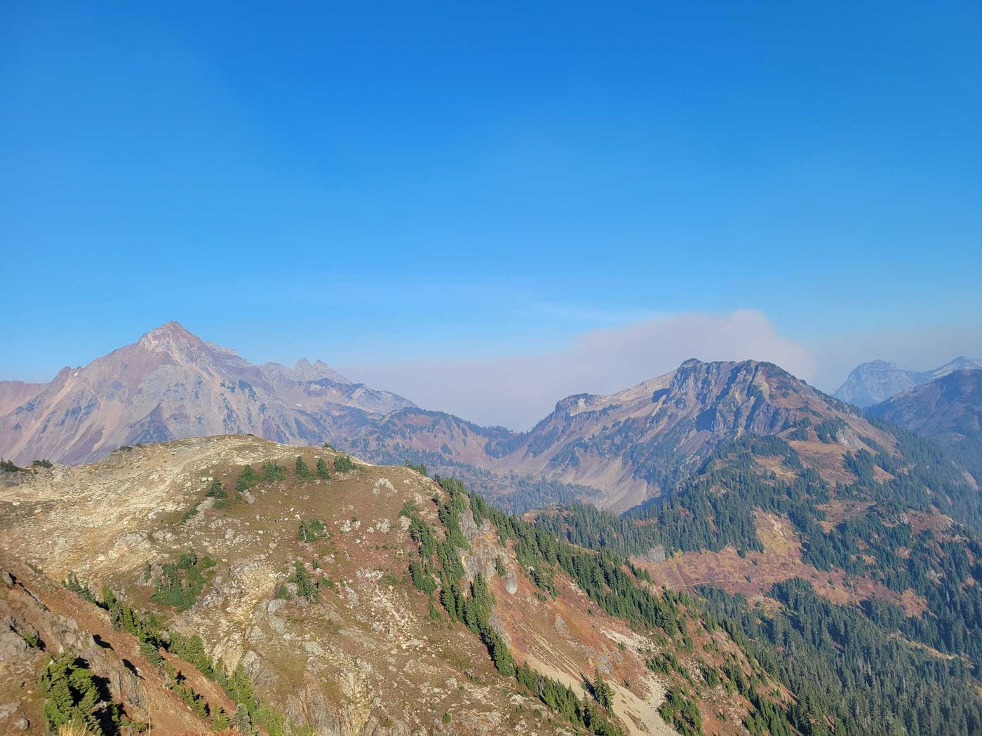 3. While it was much better air quality here compared to further east and Bellingham, there was still a haze and the smell of smoke, and I could feel my throat kind of tickle from the smoke during the tougher inclines when I was breathing heavily. Once we got to the top, I could see thick smoke to the east due to the Silesia fire (I think) and also saw billowing smoke to the southeast (definitely appeared to be rising up from a fire directly below versus being blown in by the wind). It appeared that the Silesia fire was spreading further north up the valley to the east of the pass. This smoke appeared in a matter of just an hour or two as far as we could tell, and definitely freaked us out to be able to see an active fire that close. After watching the video of the Teo guys trapped by the Bolt Fire a few weeks ago, we decided that was too close for our comfort and did not dawdle on our descent. We ran into a couple that were hiking out after staying the night before (14-15) and they mentioned that the smoke was so bad that the AQI was near 400 and they had even considered calling a helicopter for evacuation. Unfortunately, the smoke is very difficult to see from the trail until you get towards the top, so we let people hiking in know that was some newer smoke that was getting closer, but most people seemed unphased. once we got back to cell service, I checked the maps again and it looks like the Silesia fire had grown over 433 acres in the past 24 hours, extending almost a mile further north in the valley, so felt a little justified in my freaking out, but it probably was an over reaction. The people backpacking were probably not in immediate danger of the fire spreading, but I am hoping they did not have a super smokey night last night!