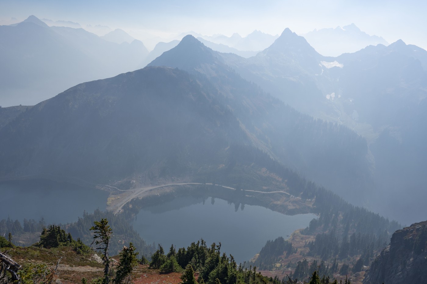 Finally made it up to the lakes, and it was pretty empty, so we applied some bug spray & sunscreen and started our hike. It was slow-going up to the top, not due to difficulty, but more so because of all the picture breaks. Even with the smoke, the scenery in this part of the Cascades is unmatched, and most the peaks were out, well into Canada.