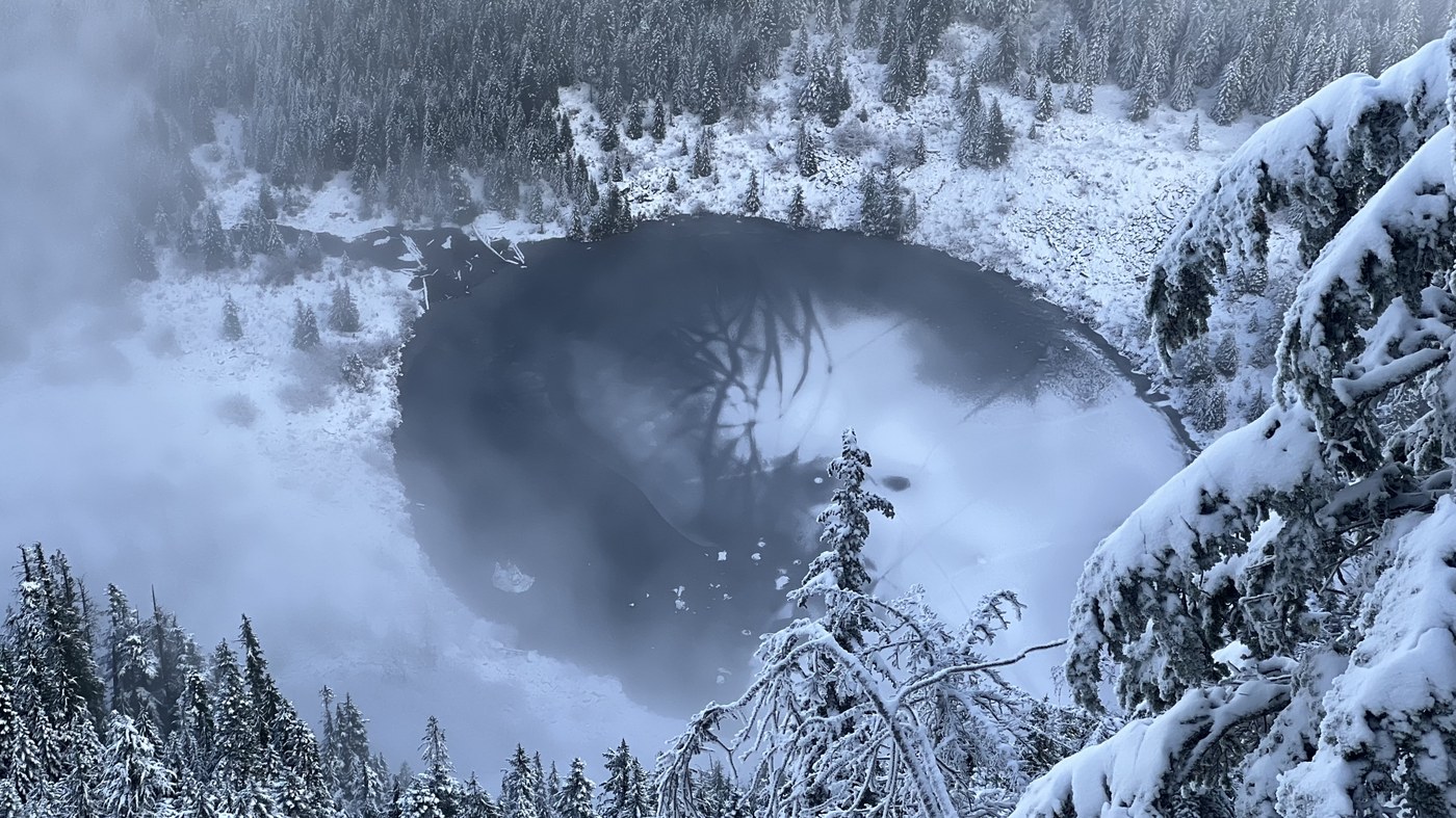 There was some new snowfall yesterday as there was 4-5” of new snow at the top of Dirty Harry’s Peak. Snow became consistent on the trail past the intersection with the upper balcony. The creek crossing at the museum was easy to cross as the rocks were above the water. A few other groups of hikers blazed a trail through the snow before me this morning, so there was a nice track. Some of the vegetation was encroaching the trail with the weight of the snow, which was a pain. I put gaiters on but left the spikes off. Snow was getting a bit slushy on the way down, so when it freezes tonight it’s going to be icy. It’s always a good idea to bring micro spikes with you on every winter hike, as you never know what conditions one may run into. Also the upper trail/road is steep in places. Hiking poles were helpful on the decent. Fog kept hanging around, but I did get a few peek-a-boo views.