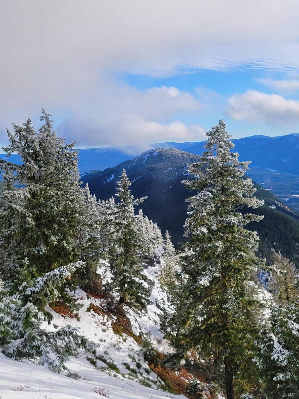 Road was snow covered and icy. 4 wheel drive was helpful. Trail is icy and snow covered, micro spikes were very helpful. Up toward the summit, the snow was about a foot deep. Route finding/map and GPS is definitely required. The last mile was very steep in the snow, you will work up a sweat reaching the beacon. Several blowdowns along the trail, made an interesting obstacle course, but doable. The trail is beautiful all along the creek, so pretty in all of the snow. Views from the summit were great, we ate lunch in the sunshine and watched the clouds roll in. On our decent, it began to snow and we returned in a winter wonderland. We clocked near 7 miles R/T and 2,300 elevation gain.