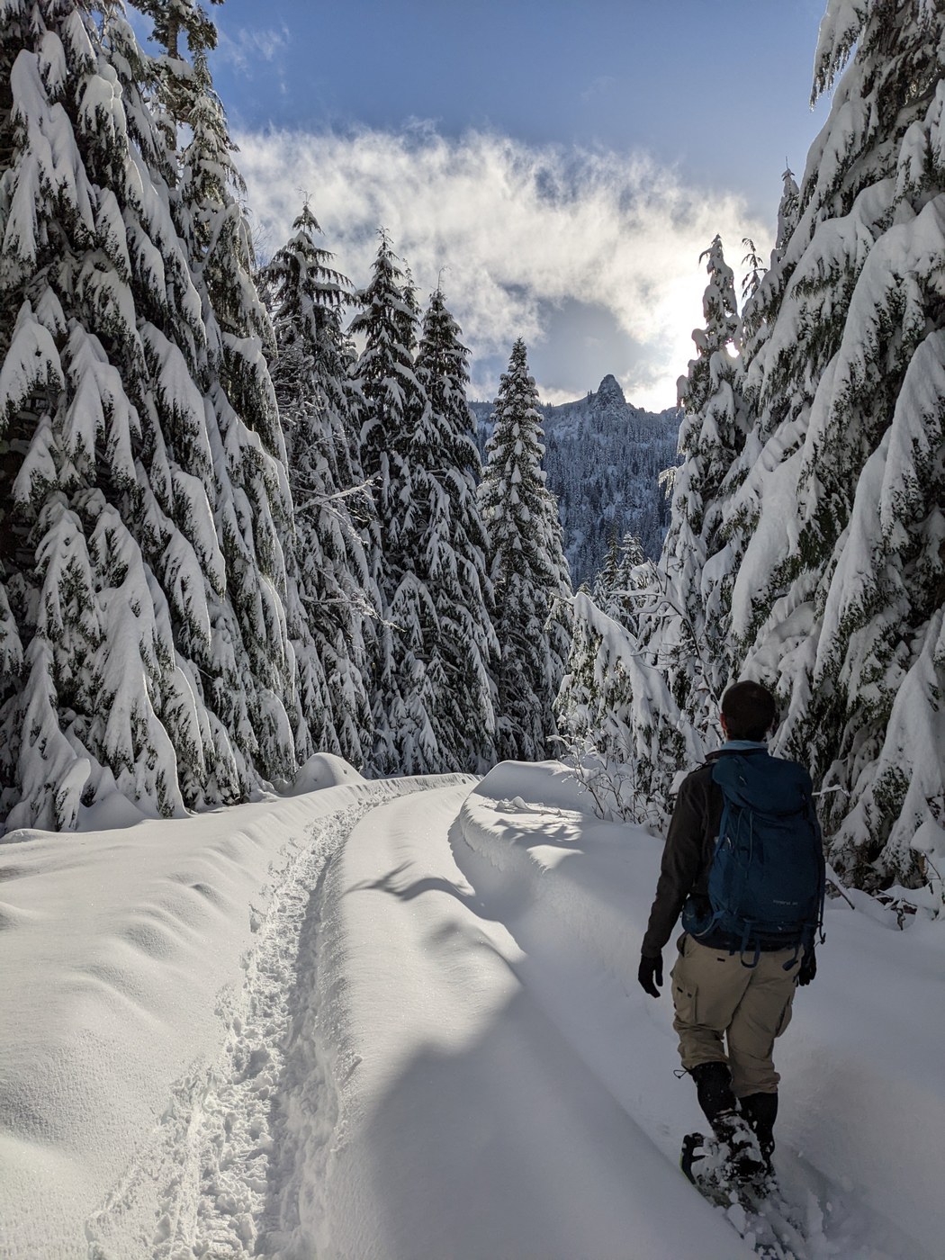 We started around 8:30 and we were the only ones there, breaking trail through new snow. It was a made a little easier by old vehicle tracks that had compacted the snow some, but it had at least 6 inches of new snow which made it slow going. By the time we got back it was a totally different story. We saw two other hiking groups on our way down, then a couple Jeeps. We also saw a 4Runner that was badly stuck and a super nice guy with an ATV came by and helped us get them out. When we got back to the parking lot it was busy with kids sledding and families hanging out with a campfire going. It looked like a lot of fun.