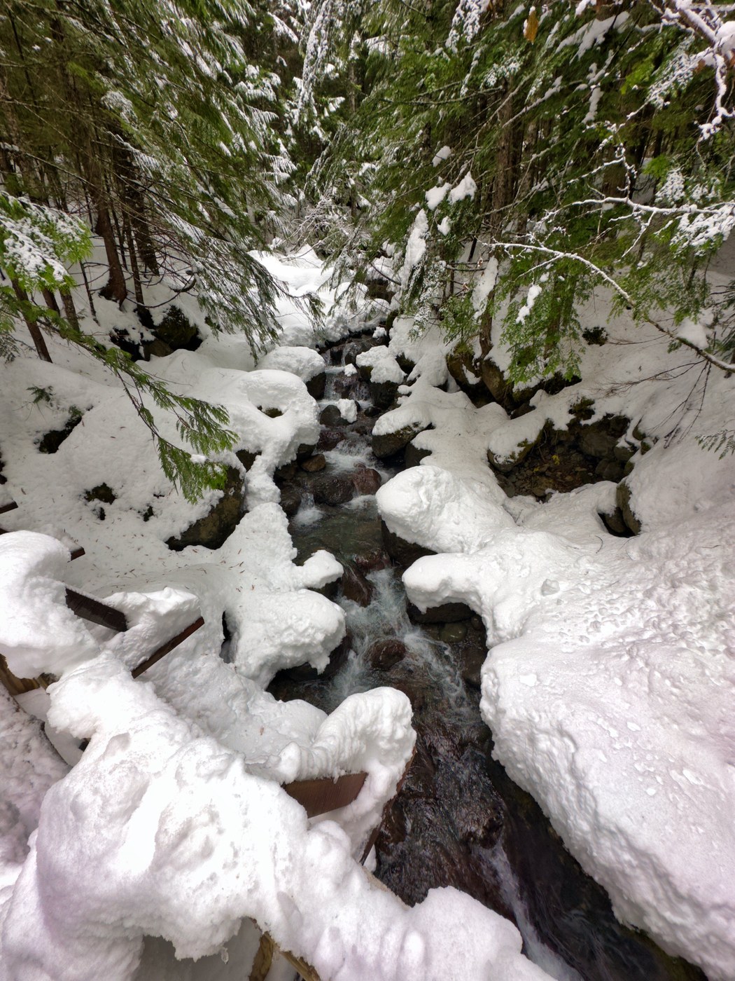 The entire road that connects Hoodsport with the Big Creek trailhead was bordered with snow, though the pavement itself was snow-free. Once at the trailhead, we parked on the shoulder of Highway 119 just outside the entrance to Big Creek campground. From there we walked through foot-deep snow on a well-worn boot path though the campground and jumped on the loop trail going in a counter clockwise direction. Being an overcast day, Mount Ellinor or Washington wasn't visible from the viewpoint 1.5 miles up from the highway.
