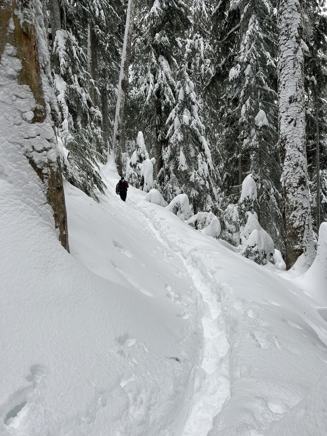 Arrived at trailhead at 750 on a Saturday and they were plowing the parking lot. The guy said this is the first year they will be plowing that road. Thank you! The trail was covered with a foot of new snow. We snowshoed until about 8/10 of a mile to the lake. The snow was waist deep even with snowshoes. We turned around at this point. It was a beautiful winter wonderland hike. We passed by about 6-10 groups on the way down. Since we did all the hard work starting the trail I bet the groups behind us finished the trail to the lake. Took us 4.5 hours. We used snowshoes but had to blaze the trail; many groups behind us were just in boots.