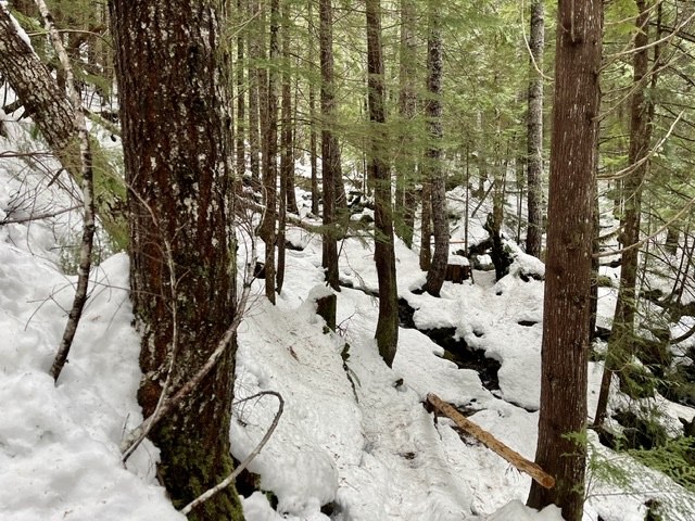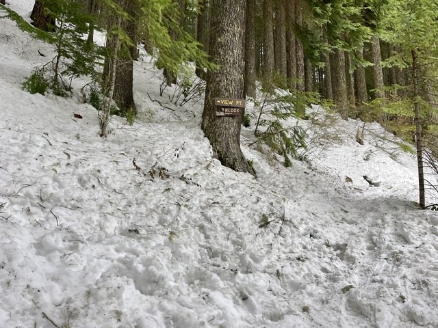 There was snow at road level and we used microspikes the entire hike. Snow was pretty slushy, but the trail is about 90-95% snow-covered with about 2 feet on the trail at top. Packed down and easily traveled, although there is lots of evidence of postholing along the entire route.