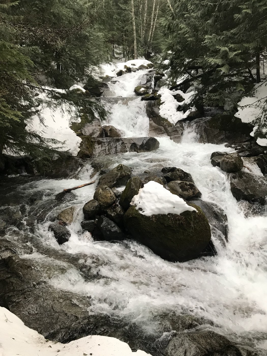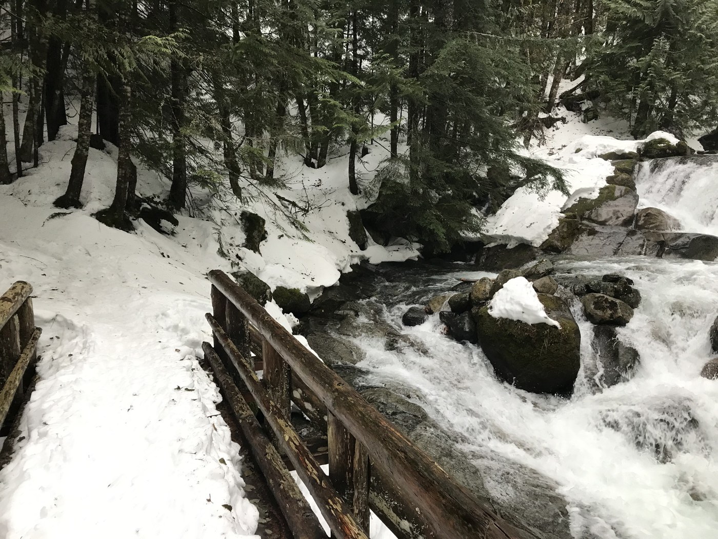 The unpaved forest road in (pictured) was basically plowed single track with pull outs. There were quite a few potholes and the covering was a combo packed snow/ice/slush, fine with our AWD. The lot itself was well plowed with large sections of black top showing. There is feet of snow starting right from the start of the trail. Snow shoes were a must. A few folks in just boots (mostly families looking for snow fun), were post-holing like crazy down to 12-18 inches, even with snow shoes we did not always stay on top. Most of the boot only people (just a few groups) headed to the nature trail. After exploring that loop (separate report) we headed up the lake trail. Although the trail was not too difficult to follow the recent rain has washed it a bit so it was not always distinct. Or perhaps I should say the rain has washed debris down into gullies making them look a bit like trails too. Nothing freaks me out more than being lost in a snowy forest so our group had Gaia and did check to make sure we were good after a few sharp climbs I did not recall from hiking here in the summer. That's a lot of detail considering we only went up as far as the power line crossing. We had hoped to get up to the Palouse-Cascade trail crossing but were running out of time. I'm not sure how much further up the lake trail I would go after the PC crossing as the avalanche chutes further up are not to be messed with.