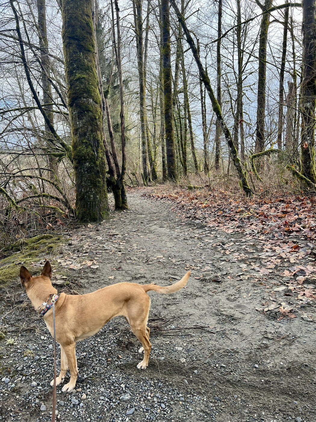 This park is relatively close to home (40 minutes from South Everett), so thought we’d go explore on this balmy winter day. There were about 4 other cars in the day use parking lot, but we didn’t run into a single other person on the trails. Super flat, and only a couple of puddles (on the south trails). We enjoyed walking along the river, tons of huge maple leaves on the ground, mosses and snow berries galore. Watched a hawk being chased by crows and a pair of bald eagles enjoying a riverside snack. We did the north loop out of the parking lot, coming back by the yurt village, then swung down past the campsites for another loop. Just over 2 miles total. Nothing fancy but always fun to explore outside. 2 porta potties at the trailhead were open and stocked.