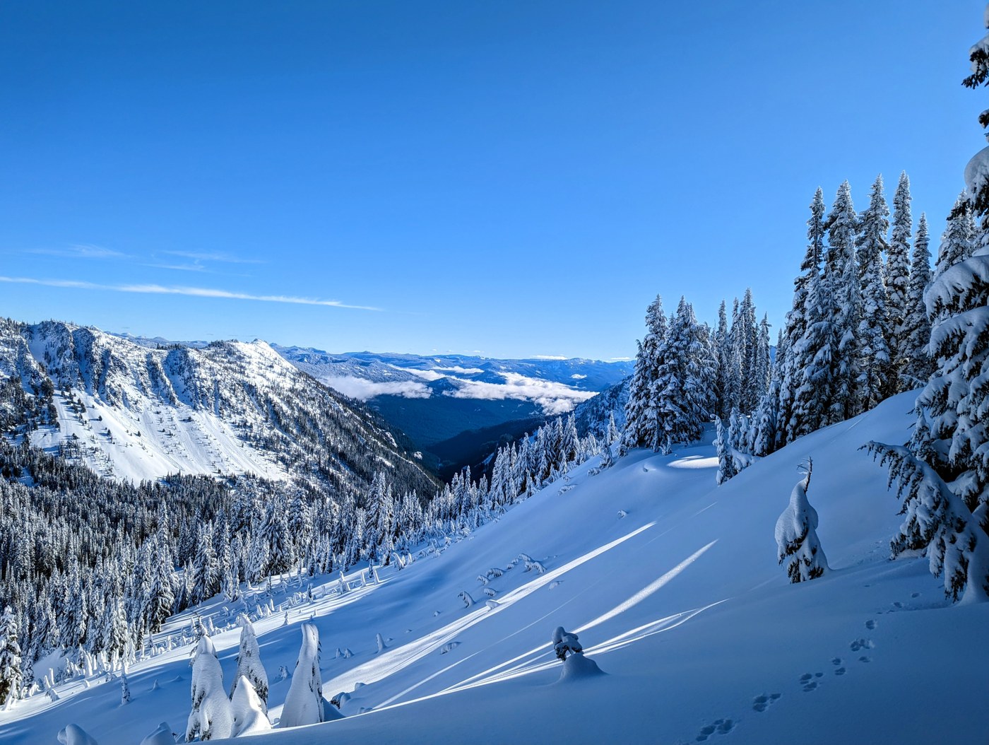 There was a seasonal creek crossing hidden beneath the snow shortly after the junction that branches off toward Faraway Rock. This creek crossing was a steep valley in the snow. We couldn't find the official location to cross and instead took the flattest section we could find. Due to the snow depth this time of year, there was little risk of falling through, but I'd be wary for anyone attempting this route during spring.
