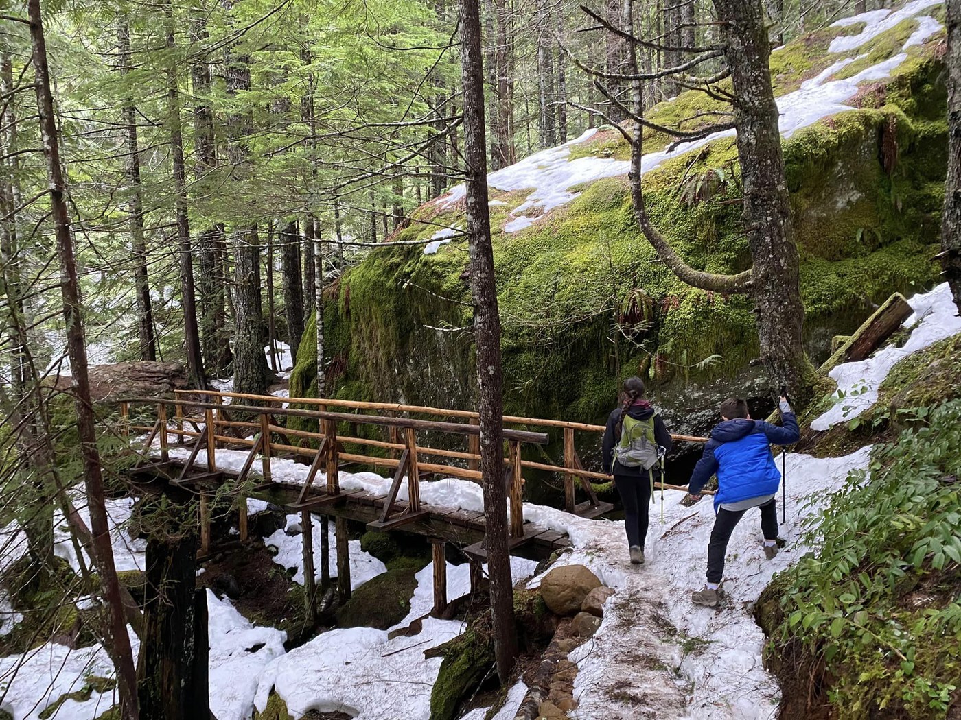 Best way to ring in the new year, by hiking an old favorite. It has just enough of a climb to remind you you're alive, but not enough to make you wonder why you chose this trail. With the campground closed you have to park along the road or try to squeeze into the tiny parking area in front of the gate. The campground bathrooms are also closed so plan accordingly. And please don't be like the people that thought it was ok to just leave their TP three feet off the trail on top of the ground. Come on! Pack it in, pack it out, dig a hole or get a Kula cloth, don't be a jerk. End rant. We chose a counter clockwise route and the snow started about two miles in, just before the Troll Bridge. It was packed down but soft enough that we were ok with just boots and poles, didn't need to use our microspikes. The snow was intermittently along the trail until we got closer to the confluence area, then it was solid snow, but easy to hike on. Some of the bridges required balancing on a ridge of snow to cross, or try to straddle it but all quite manageable. The hike down from the junction to the viewpoint/Ellinor connector was easy going with the snow ending a quarter mile down, or less. The trail was in great condition thanks to the hard work of trail crews.