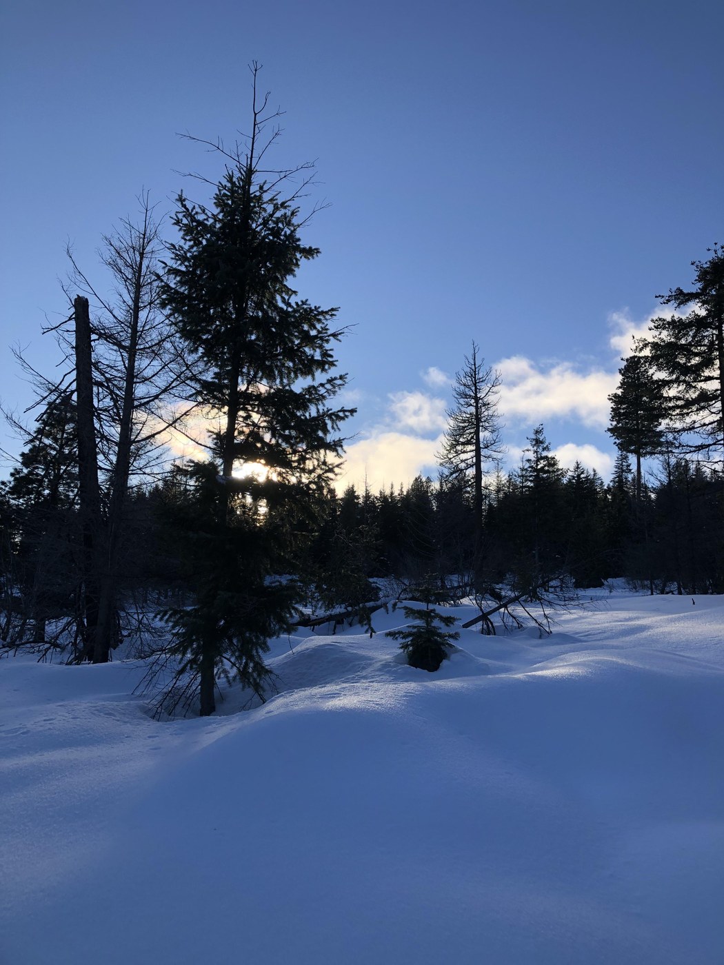 It's mostly uphill for 2 1/2miles up Rye Creek Road, then we left the road and headed straight up Tarzan Butte, which is pretty steep. There were many downed trees, because of the fire a few years ago, so even though everything's buried under the snow, there was a lot of climbing over the covered logs and had to be careful not to step in the sink holes. No tracks, so we made our own. Did I mention it was pretty steep?