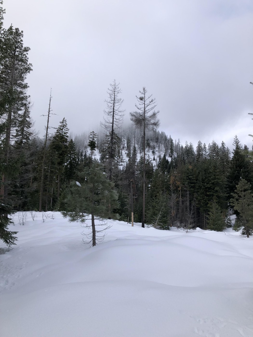 Best thing about the Teanaway is that you can be alone on the weekdays. We parked at 29 Pines campground. We started up Jungle Creek, until we crossed the NF Teanaway and hit the turnoff up Rye Creek, where there are no snowmobiles allowed. There were no tracks of any kind (except animal) up this road, which really surprised me. It looked like everyone was staying on the road heading up Jungle Creek.