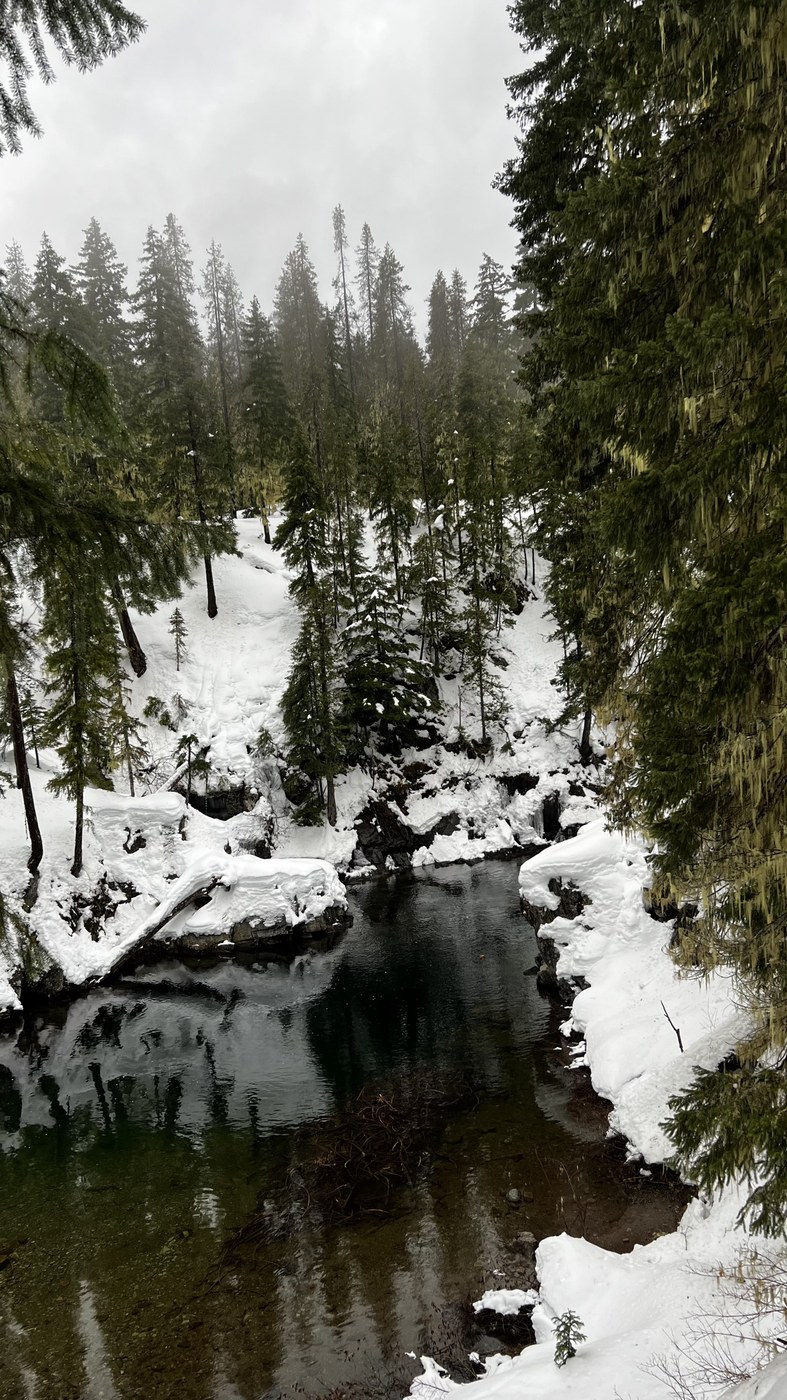 The trail itself is not super hard as elevation gain is low, however it’s a long trek. A total of 10 miles round trip, took us about 5 hours to complete with all the ups and downs and lots of pics. There was a huge tree down that you’ll have to crawl under and a few areas that were very narrow for snowshoes on the slick steep edges along the ridge. I fell a few times. Snow was mostly compact.