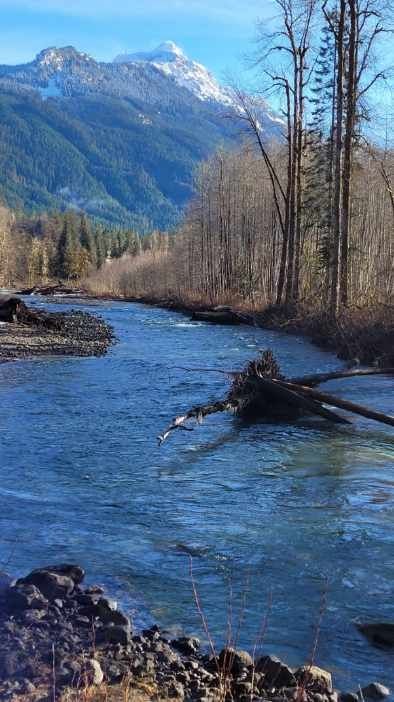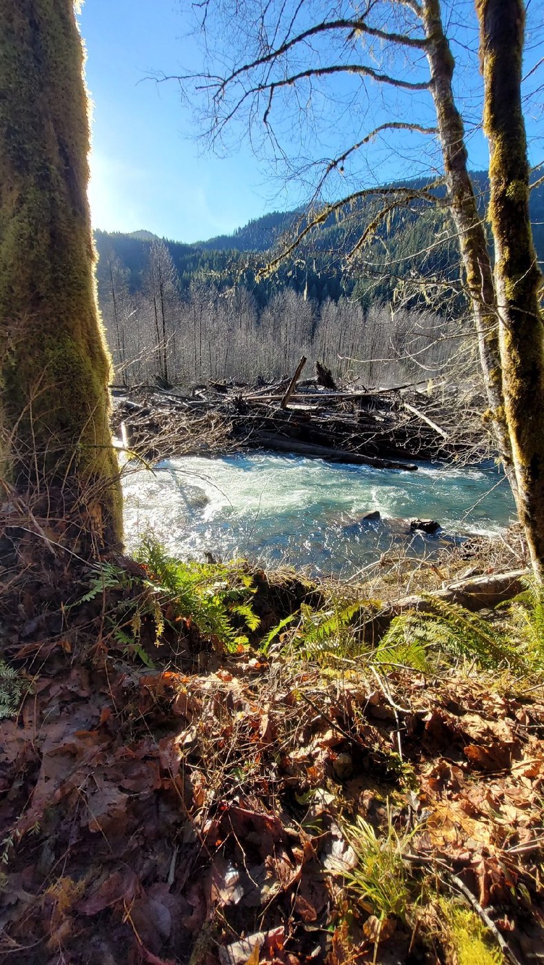 The sky was blue and the air was crisp so headed out to hit the trail. Beaver Lake trail is approximately 30 miles east of Darrington. We didn't see anyone even on our drive out. Parking lot had snow and ice, only vehicle there. The bathroom was unlocked but not monitored. We used microspikes to navigate the parking lot and for the first part of the trail. We started around 10:45 am so it was still pretty chilly. The trail had lots of debris, a number of blow downs although we could climb over most of them. There was one slide with a tree as well that we climbed over. Due to melting snow the trail had lots of water but most "streams" are navigable by stepping carefully on logs or rocks. The clincher was the bridge about 1.25 miles in that was taken out on the far end by a tree that was still on the bridge. The barricade has been nailed in place to keep someone of walking into the smashed part of the bridge. My husband attempting a work around to no avail. You'd need a flotation device to get across. We could see Beaver Lake but couldn't get close to it. We turned around at the point. Upon returning to our vehicle, we found a location not far from the parking lot to test out a hammock I received as a product tester for REI. It's a camping hammock as opposed to a lightweight backpacking hammock. So it was a good day despite a short hike. We tracked 2.5 miles RT with 80' EG. It's a beautiful area and doesn't look like it would be busy even on the best of days.