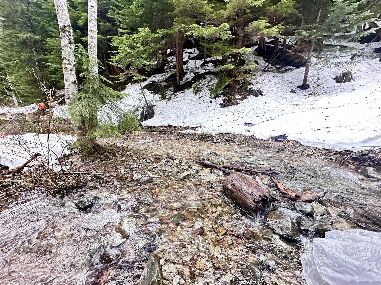 Have not tried Mount Washington in the winter yet, so gave it a try. A few trees down (about 5-6) that are annoying, but can get under, over, around. Def wear waterproof boots. There were 2 streams where the water would go over shoes unless you try fairly hard for it not to. 1st picture shows one of the places the trail is water covered. The snow was hard packed in a section which was wonderful, but before and after that is was loose and annoying. I turned around at the upper talus field/boulder/rocks part. I know at least 4 people made it, but at least one other guy turned around. It was a very narrow path and slippery loose snow. I did have spikes on, but since I am a chicken, and one could still post hole into a few places that were deep, I was over it. The view was not going to be great anyways. Lucked into a few decent ones on the way up, but the clouds and rain rolled in by then. I did post hole up to my hips by a rock in the loose snow part on the way back, so I was doubly glad to have turned around. Second picture shows a kind of loose section, but not the talus field area... I was not going to pull my phone out on that There it was flat, not on a steep enough slope like the other. Though it was nice to have some of the roll-y rocks covered by snow, I will not do this one in the winter again. Makes me appreciate going back and doing Si and Mailbox for another few months, until trail conditions get better. At least with the most popular trails, people often cut more of the annoying trees before the other trails. We down to Twin Falls upper view point from the main service road to make up the lost miles. That is 0.9 miles each way, so ended with a surplus.