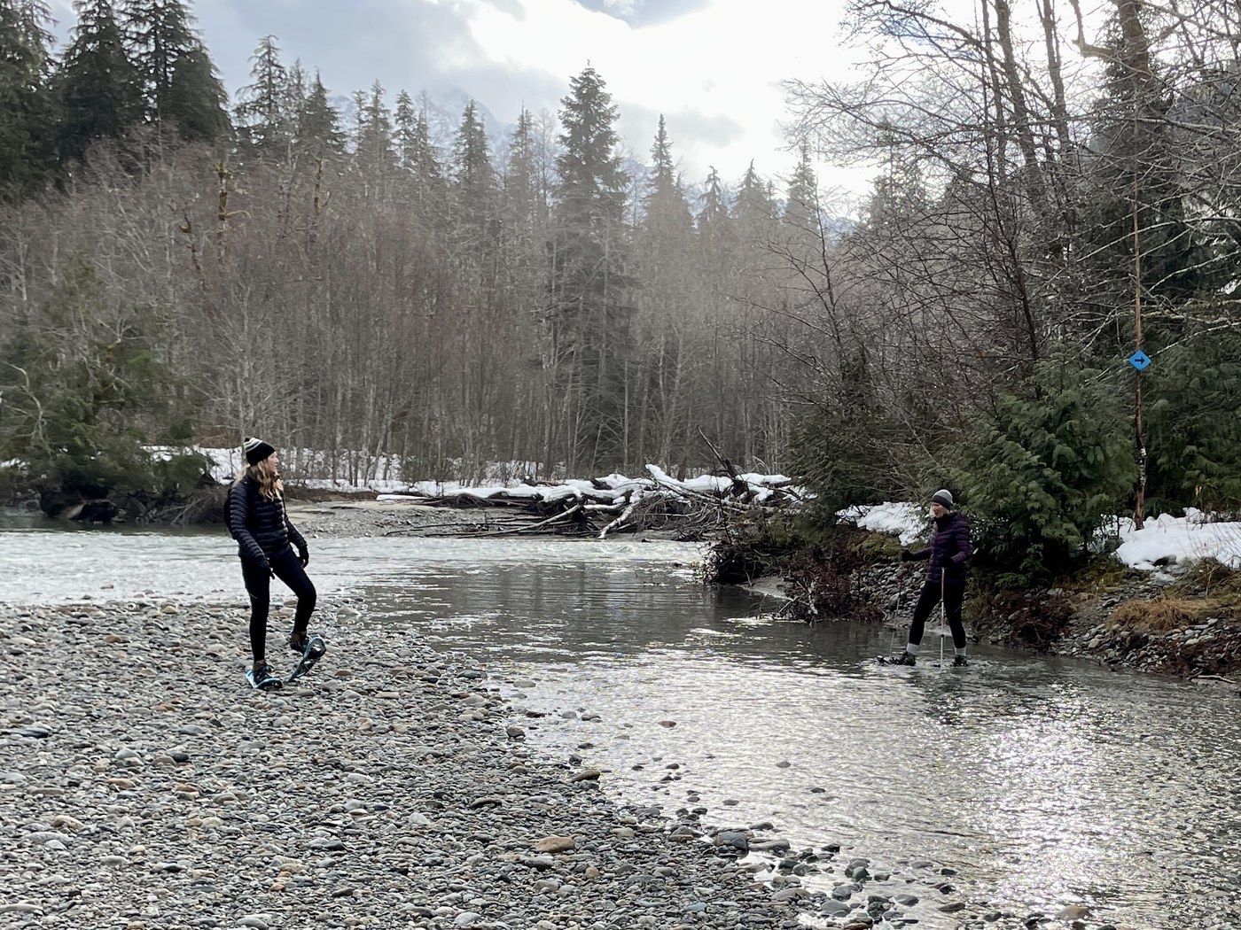 ***WARNING #2: At one point where it gets close to the river, the trail just ENDS. The river has washed away the outer bend of the trail. We carefully stepped into the river, crossing to an island of dirt and gravel (see photo). We made our way downriver, following the blue ribbons on shore that marked where the trail used to be. After 100m or so, we crossed back to the shore, and picked up the trail heading back into the woods. I would only recommend doing this if you have waterproof boots. Of our three pairs, two stayed nice and dry, the third pair (oldest pair) left my wife's socks a bit damp. At times the water was only a few inches below the tops of our boots. It does look like there is a narrow makeshift dirt trail along the shore, but we didn't want to do more damage, and it looked too narrow for snowshoes.