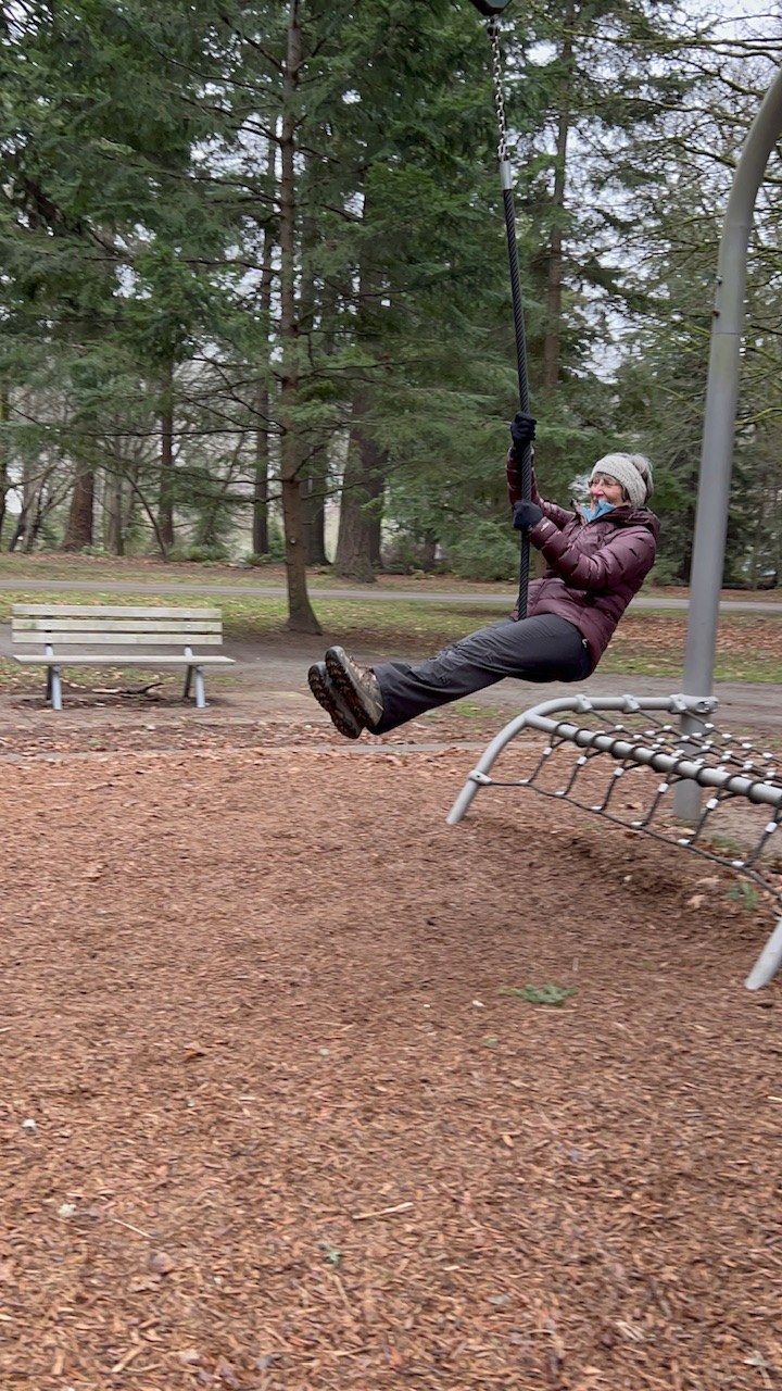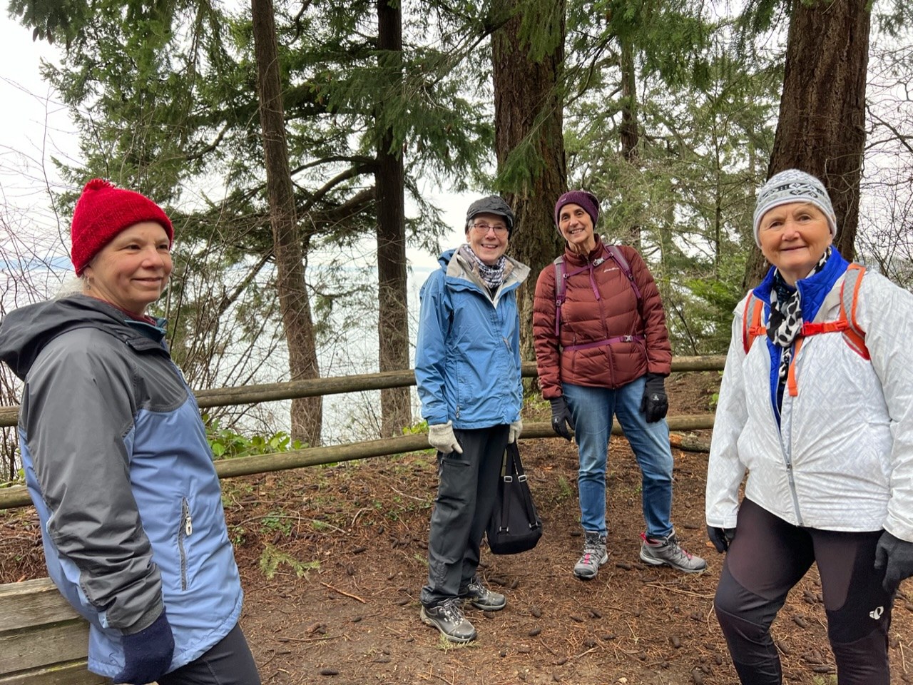 Today my hiking group made our annual trek to Lincoln Park. We met just north of the park at Lowman Beach Park stairs opposite the Murray Control Facility. It was in the low 40’s with overcast skies. Staring south along Beach Drive into the park we met early morning walkers, dogs and runners on Trail #1 above the beach. A few shore birds were floating just off shore and the sound was calm. We kept to beach trail to the south end of the park and a stiff breeze picked up once we rounded the corner after Coleman Pool. Several locals commented on our group and asked where we hailed from. Woodinville to Puyallup was the answer. A preschool group greeted us as we approached the south bathroom facility. It was open, clean and stocked with supplies. Kim, a West Seattle local, guided us through a myriad of trails in the upper park. We stopped to check out the kids play area and glide swing. After traversing North and back south down the beach trail and back up again we racked up a nice 4.5 mile walk. All the trails were open and clear of debris. Many trails were covered with small fir boughs. Seattle Parks workers were out servicing amenities. Another fantastic day out in nature with friends.