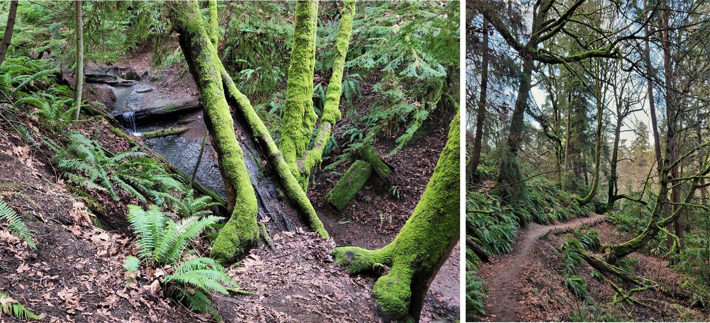The trail is a gentle uphill until it passes underneath Admiral Way and enters the main area of the preserve. Inside the preserve there are a set of primary trails that follow the creek on both sides. One can do a short loop or a longer loop. These trails are in pretty good condition except in the low areas where there is some mud. It isn't deep or particularly troublesome, but boots would be recommended this time of year. Beyond the central loops there are several spur trails that take off up the hill to various access points for the surrounding neighborhoods. These are narrower and twistier (is that a word?) than the main trails, but provide the opportunity to find unique things, like the big Douglas Fir tree (six feet in diameter) that had a big leaf maple growing right on top of its root ball. I also found some of the biggest, oldest cedars in those areas, and even a few red huckleberry bushes. I followed almost all of them to their ends, just for fun.