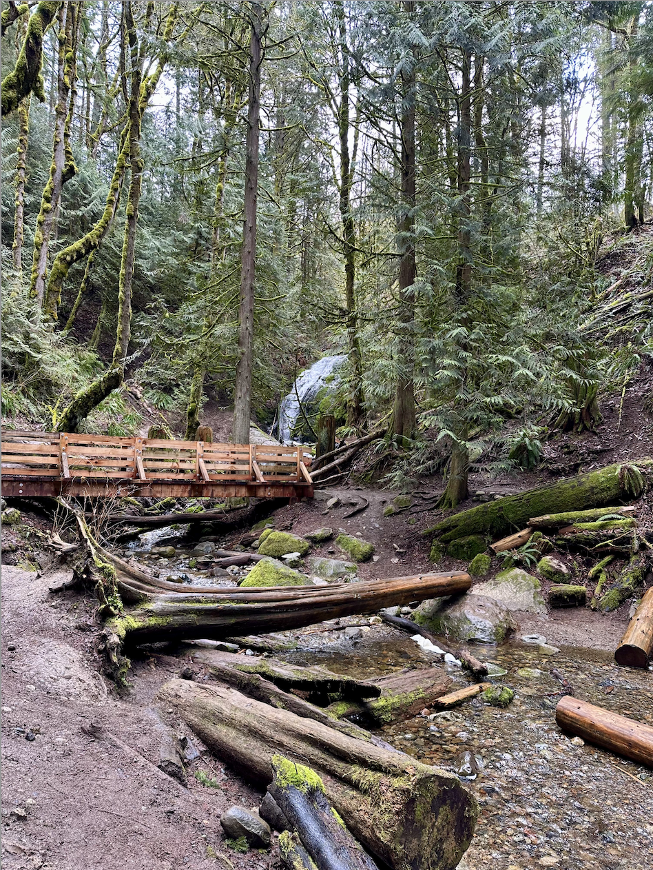 Crossing the road to the Red Town trailhead, we continued on to the Cave Hole trail which branches off from the Red Town trail. We enjoyed a snack at Coal Creek Falls, which was flowing heavily! When we reached the Quarry trail, we took a right to head back to the Red Town trail and made our trek into a loop. There was a WTA work-party out on this stretch of trail, so we offered our gratitude!