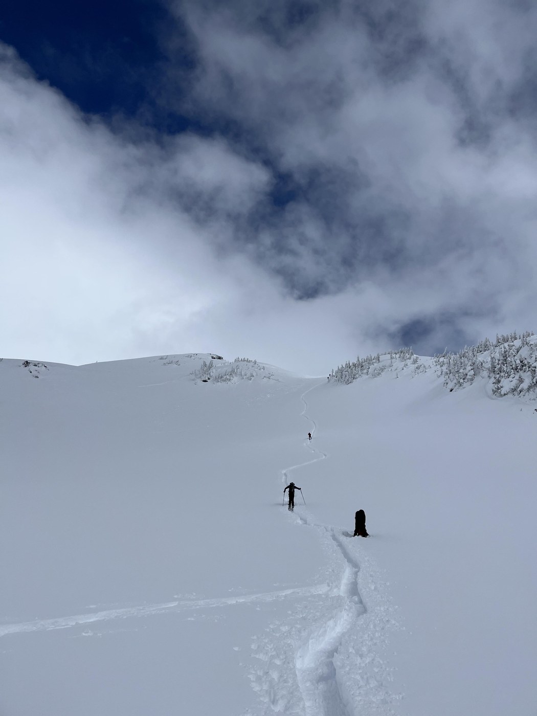The area is so beautiful and it was pleasantly busy with jovial skiers, snowshoers and splitboarders. Clouds came and went- hot in the sun, cold in the wind. Make sure to wear sunscreen!