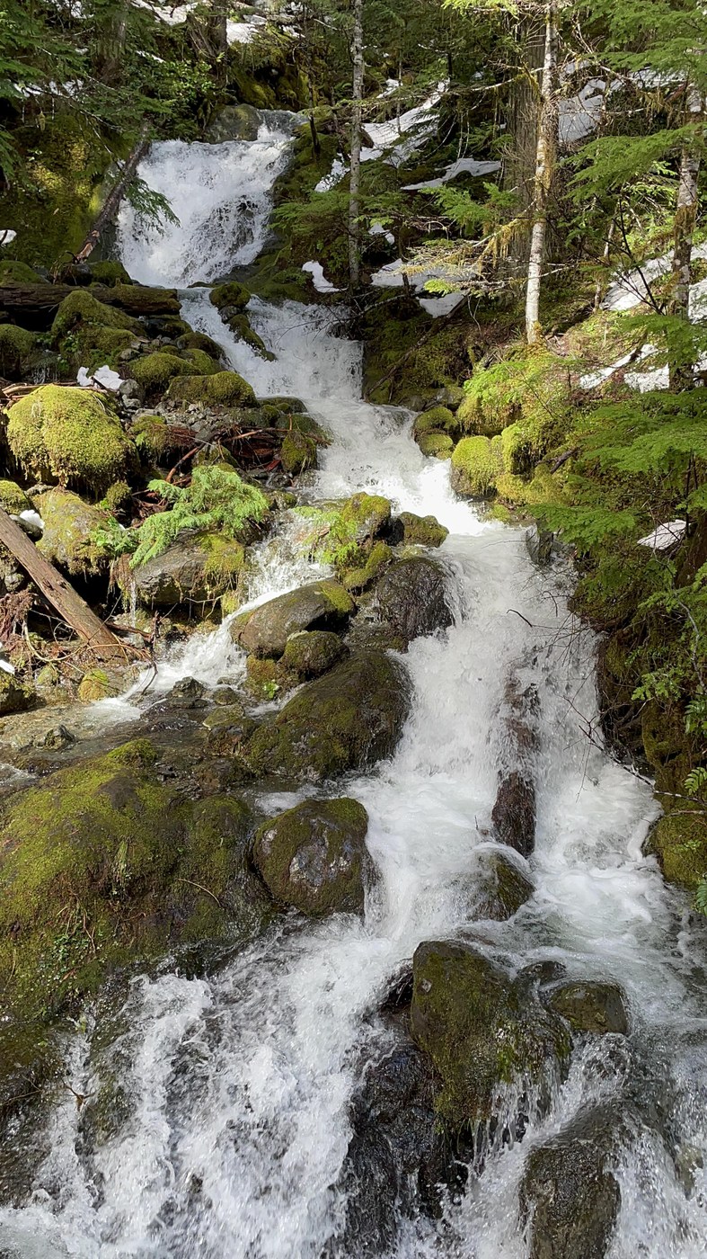 There was only one car when I arrived at 10:30 a.m. Two more joined shortly after I parked with a slow steady stream of hikers heading up while I was heading down. The road is in great condition along with the bathrooms (don't lock/lactch). The trail is holding up well in the deluge of water. It's not as bad as walking through a total creekbed like Lake 22, but it looks like higher up snow is melting fast and we had a lot of rain recently. Expect running water, most you can step on rocks to avoid...some you splash through no matter what. There's consistent easy to manage snow on the trail after the waterfall bridge near the lake. No spikes were needed. No flowers yet. The lake was vibrant and beautiful. Looked like two cars full of backpackers were heading up to camp out when I was leaving...not sure if they were hitting lower or upper Lena Lake. Happy trekking!