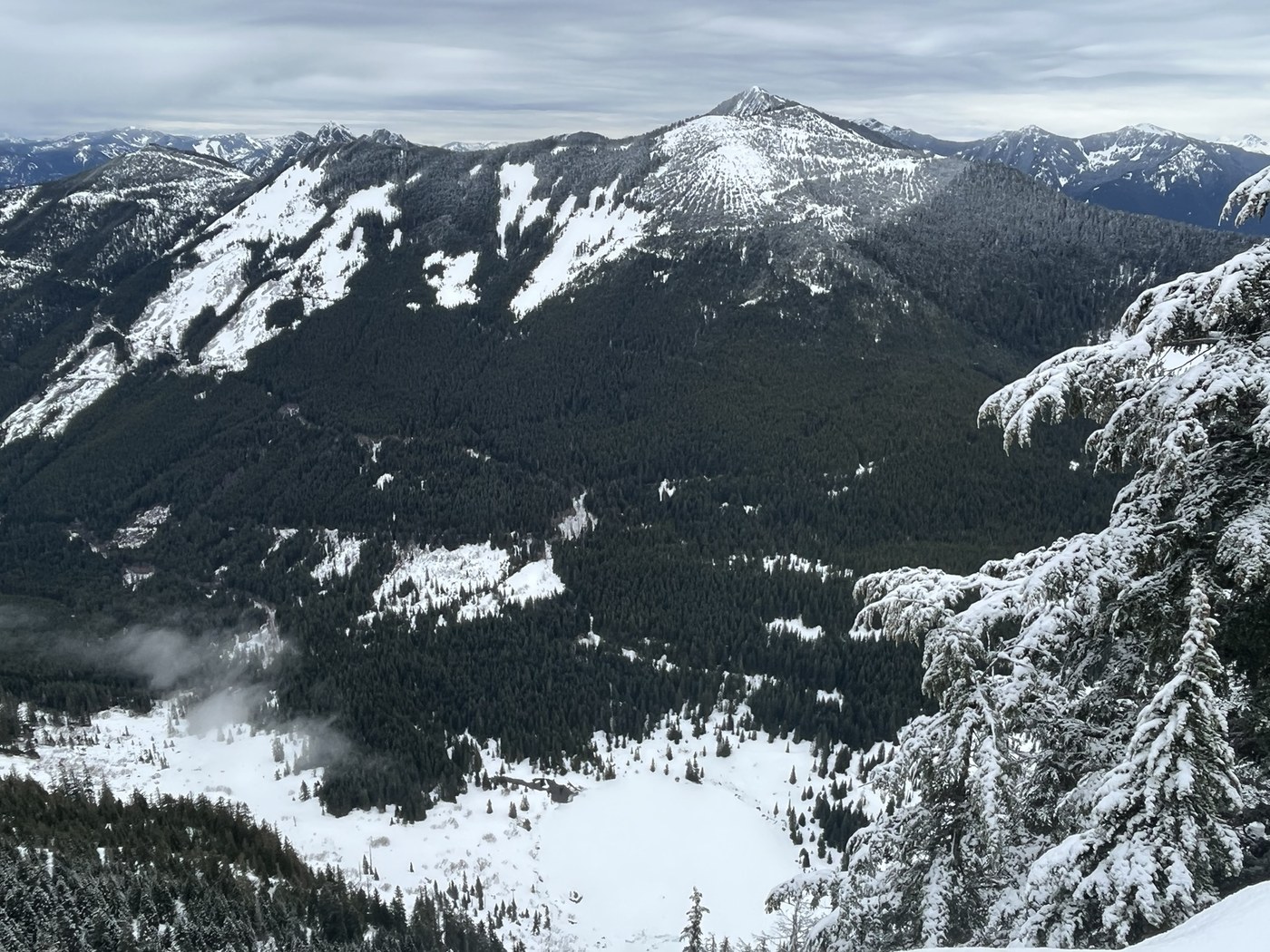 Trail in good shape, intermittent compact snow starting around the balcony, transitioning to full coverage around 3200’. Poles and traction recommended, flotation not necessary for on trail travel.