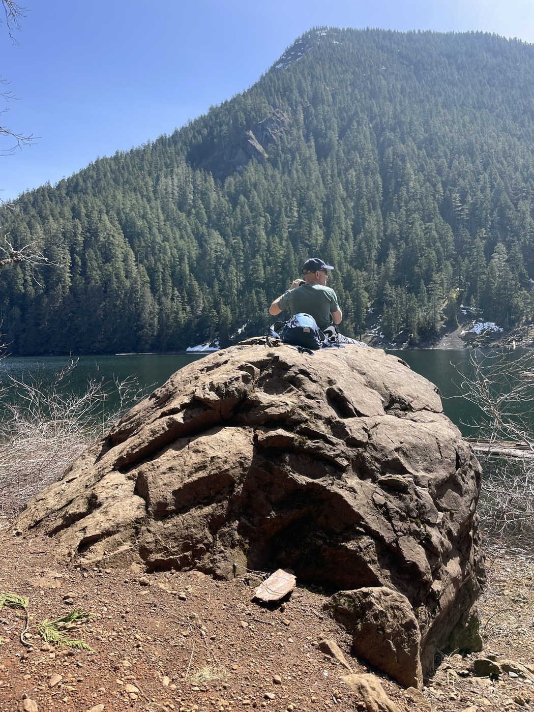 If you read Craig Romano’s (2007) trail report (Day Hiking Olympic Peninsula) on Lena Lake, you might be deterred to try it out. He mentions crowd, lots of trash, ding-a-ling switchback cutters, and neophyte hikers. Despite his description of this very popular hike, my husband and I were not deterred. Yesterday, we decided to give it a try. We are so glad we did. We arrived at the TH around 9:38am and only a few cars were parked in the lot. The wonderfully paved road made it so not onerous to get to. The easy grade trail (1300 gain over 3.2 miles) made for a pleasant, not too huffy puffy hike. The dapple-lit trail was lovely as were the views of Mount Washington and Mount Jefferson. About 2 miles into the hike, the trail was wet due to underground streams. It was not much of a problem. Encouraged by Romano’s suggestion to continue along the lake for a bit where we would find a nice lunch spot, we forged ahead. However, we never made it to Romano’s nice lunch spot due to the lack of a way to cross the roaring creek. We turned around, retracing our steps and found a lovely spot along the lake where we plopped our selves down to eat some lunch. The breeze, birds, emerald green lake, and pussy willows all combined to make for a lovely lunch spot.