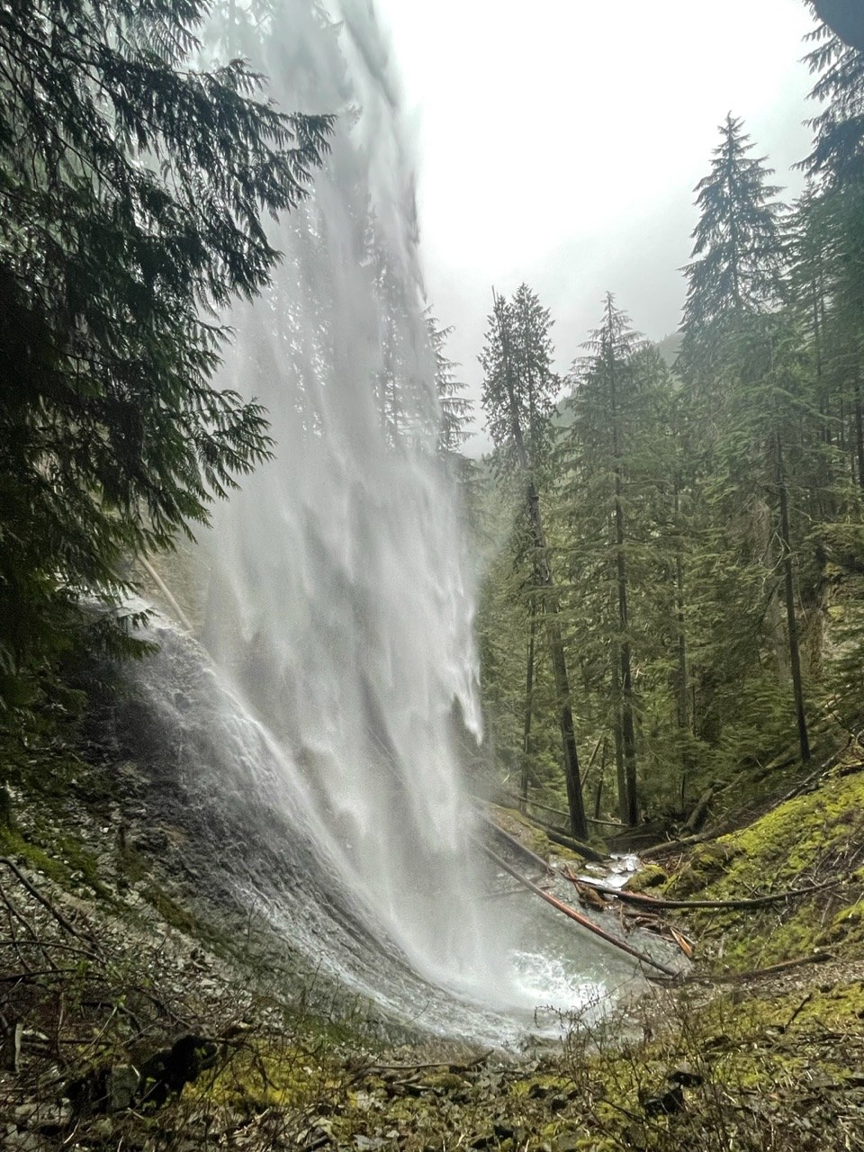 I got to the trailhead around noon. Cathedral Falls were spectacular. It was a real treat to be able to walk not only behind the falls, but also up and around them for viewing from above! The sign at the fork 2ish miles in is deteriorated and could stand to be replaced. I learned on my return trek that going to the left (Tumwater something?) yields no prize: another impassable water crossing almost immediately.