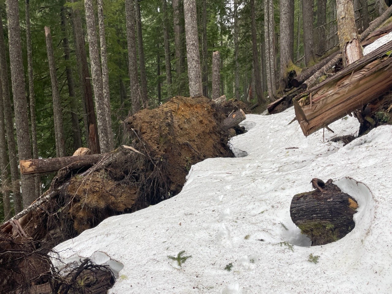 I think it's worth quickly noting that this hike is NOT, in fact, good for kids right now (and maybe ever). The trail is narrow in places with steep and unforgivingly long, often wet and slippery, slopes into the ravine just one misstep away. There are several water crossings that I wouldn't want a kid to attempt. I was glad to have my hiking poles with me. Gaiters also proved to be essential. It wasn't the snow that ultimately forced me to turn back approximately 3 miles in; it was an impassable water crossing.