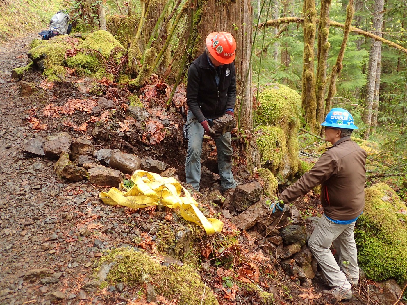 WTA work party repairing, stabilizing, and improving the trail. There are many, many hours of labor that go into keeping the trails hikable! It's a lot of fun participating in these volunteer crews, and interesting to learn how trails are created and maintained. We're in the process of replacing the rotting out curbing at the trail entrance to keep the trail edge from collapsing. Since no trees can be cut, the first task is to find a suitable downed tree, then remove all branches and strip the bark, and finally rig the massive thing into place. There are also areas in the switchbacks where erosion is taking the tread, so large rocks must be found, hauled, and then firmly dug into place to stop the soil from washing away. How about all those stone steps on the way up? Unfortunately, the glaciers didn't just happen to drop them in the right place for a trail, so after searching for and carrying them to the trail they are dug deeply into the ground in order to take the pounding of thousands of bootsteps for years to come. No experience is necessary to join a work party, in fact there was a first-timer having fun out here today!