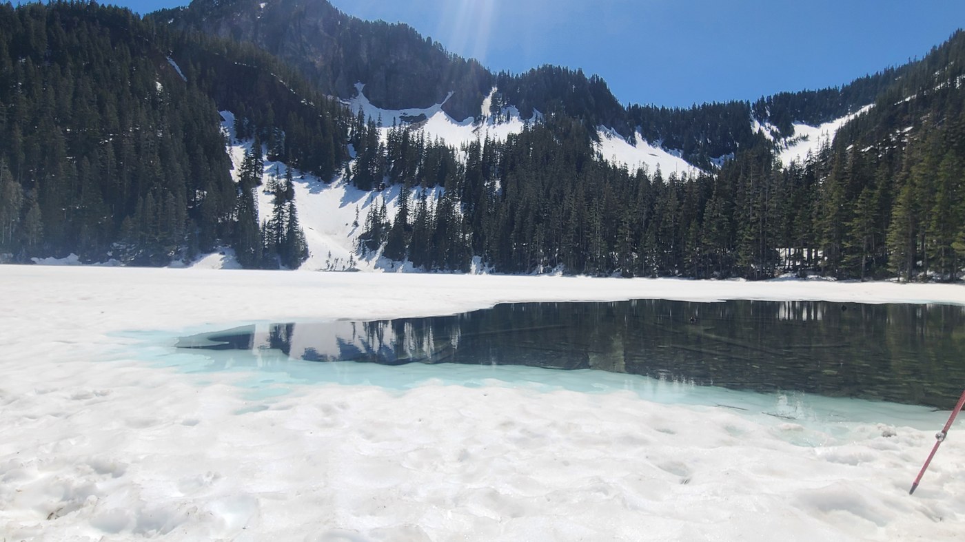 Snow on trail about one third of the way. Several trees down, all crossable. There are several steep "avalanche shoots". I was not concerned about the avalanche possibility but the trail in these areas is snowy and very narrow. A mis step could result in a life threatening injury. If you have a fear of heights, I do not recommend this trail at the moment. I felt better crossing these with my spikes on and a trekking pole with a snow basket. Snow and ice still on the lake.